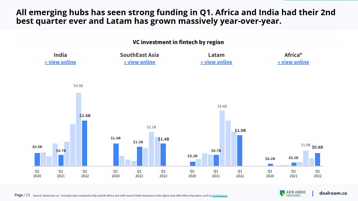 早期阶段的资金更加强劲,在第一季度达到了历史最高的 61亿美元。欧洲金融科技投资正在蓬勃发展,第一季度是有史以来最好的季度,比 2021 年第二季度增长 9%。而美国的投资则比历史最高点下降了 13%。所有新兴中心在第一季度都获得了强劲的资金支持。非洲和印度实现了有史以来第二好的季度,而拉美地区则同比大幅增长。
