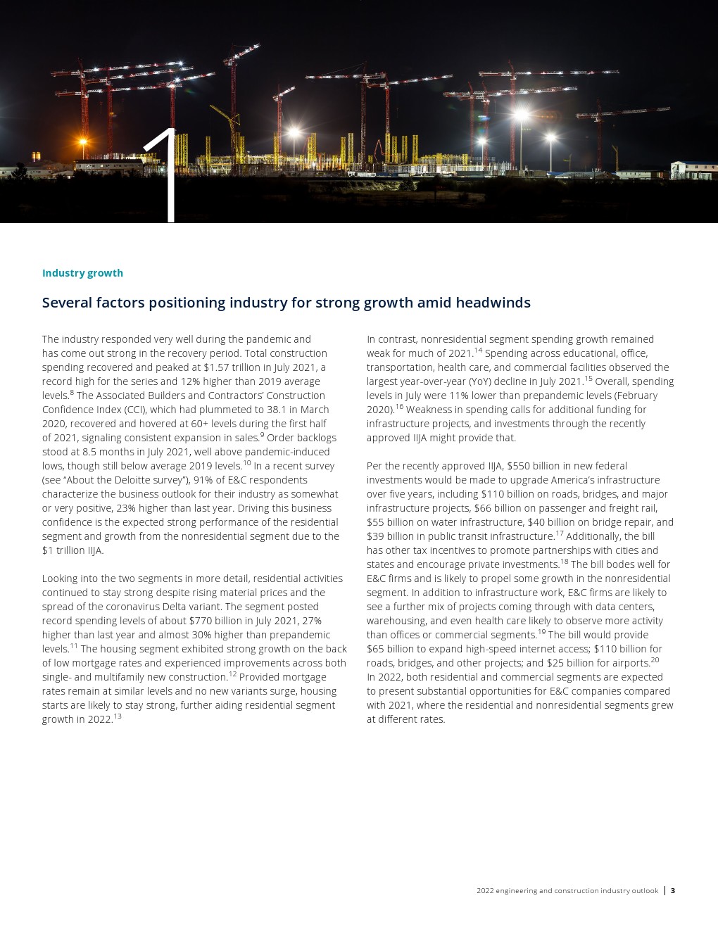 2022年,随着我们进入复苏的第二年,该行业在支持国家增长计划方面发挥着重要作用。基础设施投资和就业法案(IIJA)对医疗保健、公共安全和其他公共基础设施进行了投资,预计这对 E&C 公司来说是个好兆头,并可能加速整个非住宅行业的复苏。住宅行业预计将保持强劲,并表现出与2021年类似的活跃度。该行业增加了对数字化的投资,因为它准备转向互联建筑能力。这些技术可以帮助 E&C 公司支持智慧城市、城市空中交通和气候变化计划等,并有助于提高内部运营效率、降低成本和提高利润。