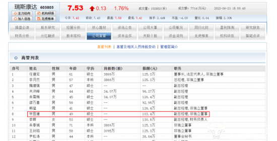 宋显建加入瑞斯康达也有十来年了,他现在的薪酬为103.4万。在这7位副总经理中处于中等水平。副总经理兼负责财务的李辉去年从公司获得的报酬稍多些,为130.8万。