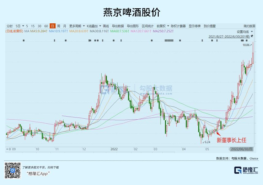 这几天,随着促消费政策和疫情防控措施松绑,消费板块接棒新能源成为最强主线,几乎所有下面的细分概念都在强势复苏。一如之前所料,消费股的行情,开始躁动升温了。今天多只啤酒股盘中甚至一度冲向涨停,成为反弹最明确的细分消费赛道之一。消费行业的投资逻辑很简单,不需要太多高深的分析,但每一只消费股的背后,都有各自不简单的故事。比如今天我们给大家说的燕京啤酒。看完它的发展史,相信大家对啤酒这个行业的认知,会有更准确深入的理解,也对大家的投资有很好的帮助。5月18日盘后,燕京公告,正式迎来了新董事长。5月20日,燕京啤酒的微信公众号发了一篇文章,是关于新董事长上任后的首个采访。毫无疑问,里面有段话引起了市场的遐想。从那个时候起,燕京啤酒的股价一直在涨,并创了21年以来的新高。 酒是A股的YYDS,尽管这一年多稍有褪色,但丝毫不影响酒在A股里的地位。然而,如果投资人端的是燕京这瓶,这恐怕是过去十几年最苦的一瓶了。燕京啤酒的股价止步于2007年,而那之后啤酒行业经历了行业整合、格局优化、结构升级的大牛市,这些都与燕京无缘。2017-2018年,啤酒处在十年来的首次全面提价之际,高瓴饮了华润,复星饮了青岛,重阳饮了燕京,从后面结果看,重阳这杯最苦。燕京的股价,依然处在它2007年以来的震荡区间里。