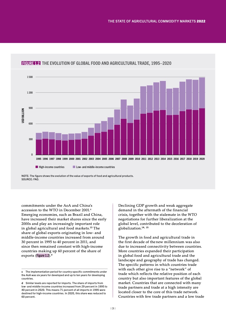 2022年版《农产品市场状况》探讨了多边和区域举措如何能够相辅相成,共同应对可持续发展在当前和今后面临的挑战。报告着眼于分析全球农业粮食市场、农业粮食体系韧性、经济增长和环境影响,认识到贸易政策无法充分兼顾所有目标,有必要采取措施予以补充。