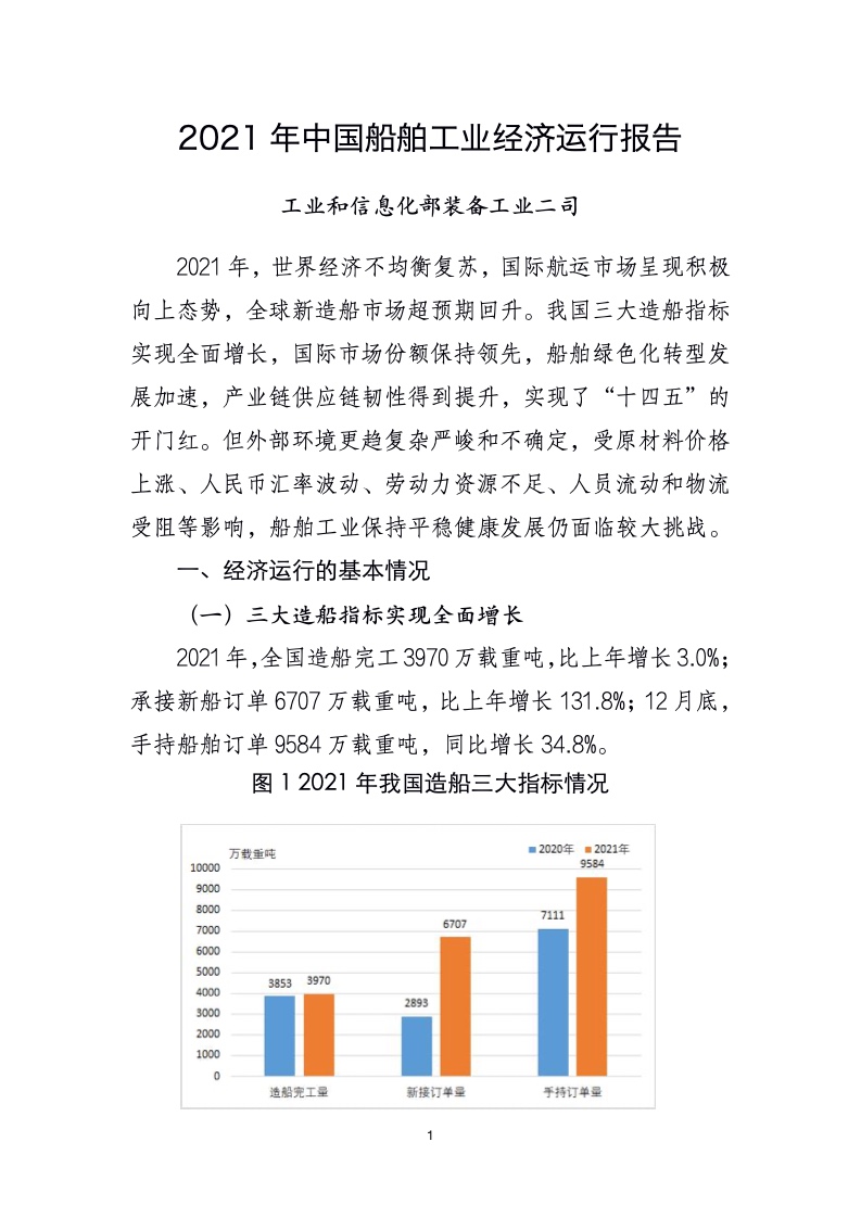 2021 年全国完工出口船 3593 万载重吨,比上年增长4.9%;承接出口船订单 5936 万载重吨,比上年增长142.8%;12月底,手持出口船订单 8453 万载重吨,同比增长29.6%。出口船舶分别占全国造船完工量、新接订单量、手持订单量的90.5%、88.5%和 88.2%。
