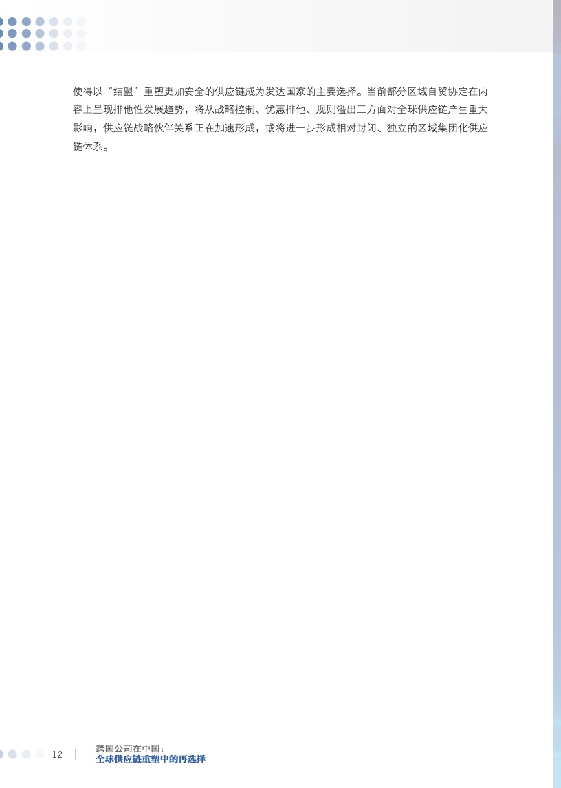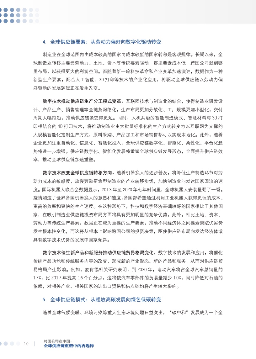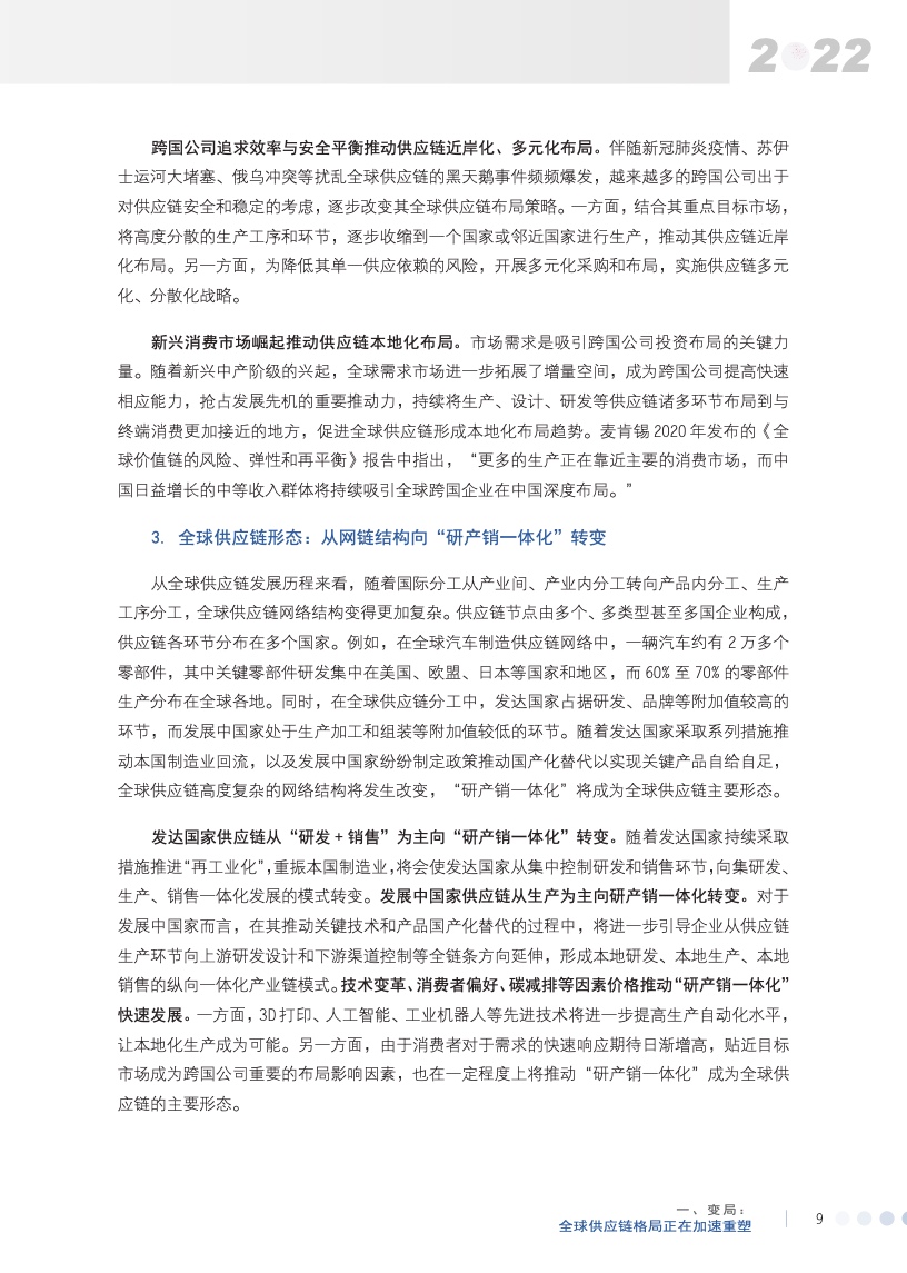 第一,全球供应链格局正在加速重构,受逆全球化贸易保护主义抬头,新冠肺炎疫情等因素影响,全球供应链格局呈现出从全球分工向区域聚集转变;从高度集中向多元化、近缘化转变;从网络结构向研产消一体化转变;从劳动力偏好向数字化驱动转变;从市场化竞争向政治权力角逐转变这五个趋势。