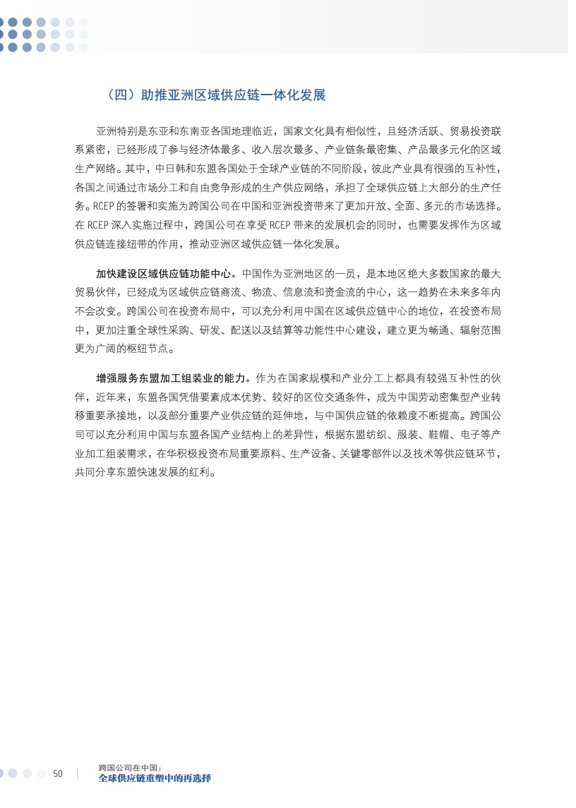 第三,中国的全球供应链优势依然明显。顾学明将中国制造业的优势概括为五个方面:一是中国制造业规模大,配套完善,供应链韧性的优势难以替代;二是中国制造业低成本竞争优势虽然弱化,但在劳动生产率、数字化转型等方面的高性价比优势正在凸显;三是中国市场规模巨大,潜力足,在亚洲供应链中的中心地位稳步上升,投资中国意味着获得更广阔发展空间;四是中国创新资源丰富,研发市场转化率高,创新应用性强的新优势持续提升;五是中国对标国际高标准经贸规则,推进制度型开放,国际合作和竞争新优势正在形成。