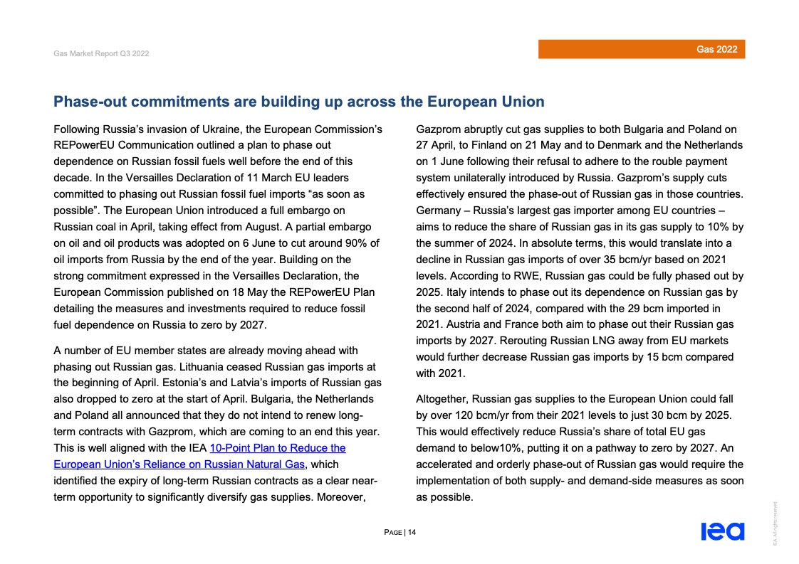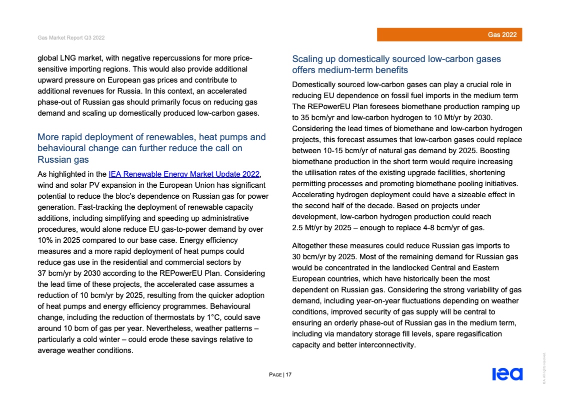 报告认为,从供应端看,到2025年全球天然气增产将集中于由北美和中东地区,但增长量仍有限,而俄罗斯则因预期出口下降导致增产潜力下滑。据IEA预测,2021-2025年期间,基础情景中俄罗斯对欧盟的管道气出口量将下降约55%,加速情景中降幅将进一步提高至75%。