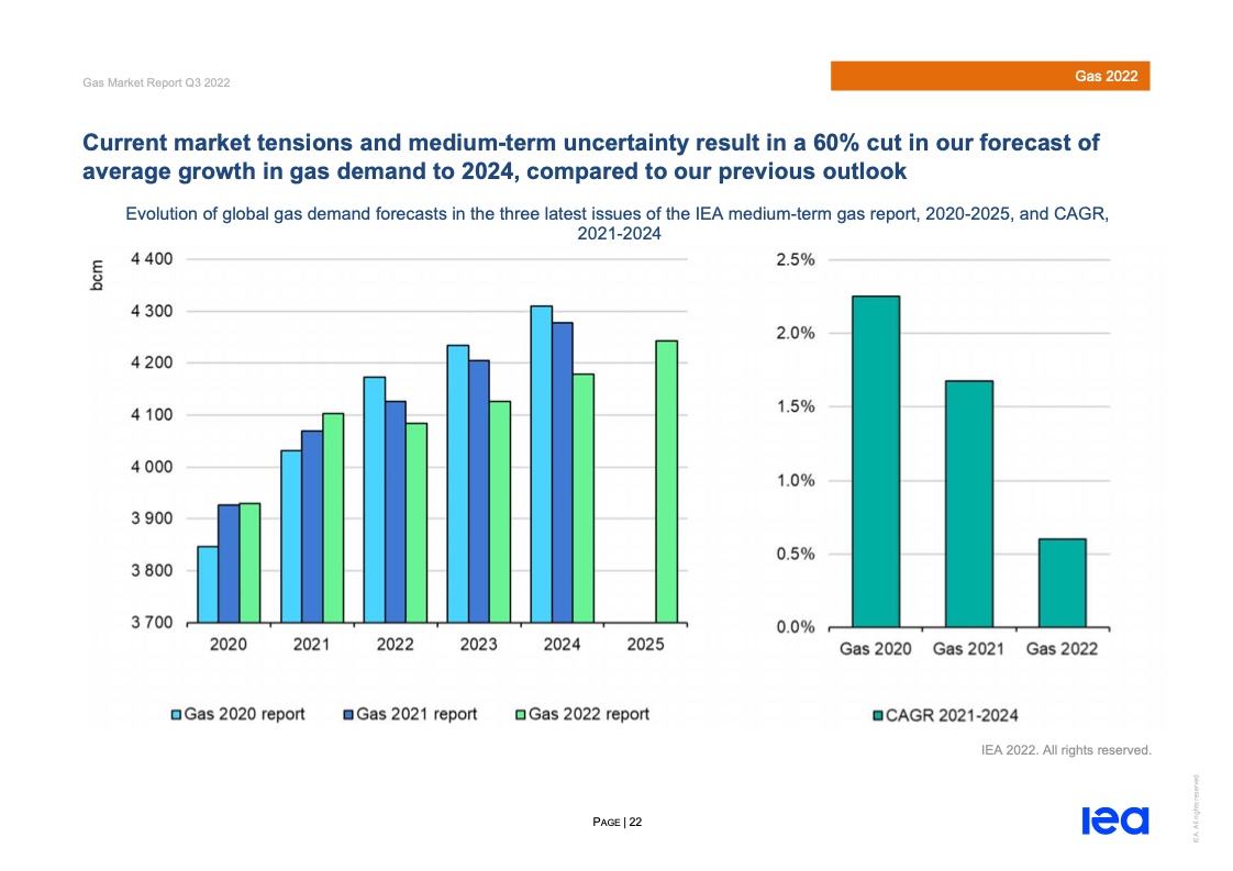 报告认为,从需求端看,在经历了2021年非同寻常的需求复苏之后,预计2022年全球天然气需求增长率将转为负值,并将在短期内停滞不前,到2025年仍有较高不确定性。早在2021下半年,国际天然气市场已经形成了高价格和供应紧张局势,2022年2月24日俄乌冲突爆发导致全球天然气市场进一步受挫,欧洲和亚洲的天然气现货价格到达历史最高点。2022年上半年,欧洲的天然气需求同比下降10%以上。受高温和创纪录的高昂天然气价格影响,工业和电力部门的天然气使用大幅下降,低于其2020年水平。潜在的俄气供应中断可能性带来了进一步的下行风险。在价格上涨的情况下,市场对北美天然气的需求继续增长,2022年上半年美国液化天然气的增量占总供应量增加的近90%。亚太地区将主导需求增长,但供应紧张会限制其增长步伐。受工业部门推动,中国的天然气增长将持续,但到2025年速度会降低。受供应局限和可再生能源的替代效应影响,中国电力部门的天然气使用在2022-2025年间将停滞。