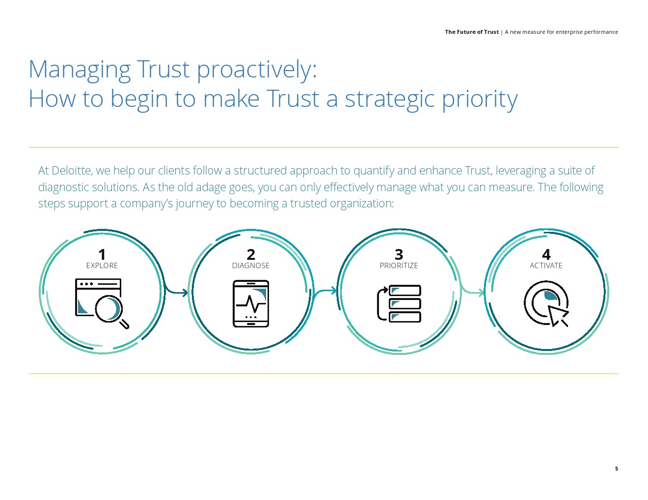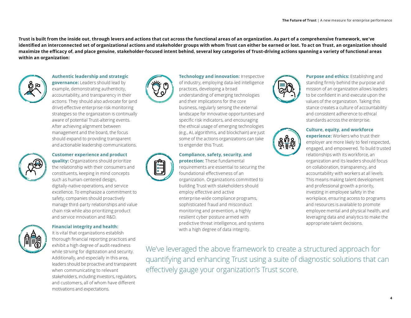 信任是通过跨越组织职能的杠杆和行动由内而外建立的。作为综合框架的一部分,德勤确定了一组相互关联的行动和利益相关者群体。为了在信任的基础上行动,一个企业应该最大限度地提高效能,真正关注利益相关者的意图放并采取信任驱动的行动,这些行动跨越了企业内的各种功能领域。