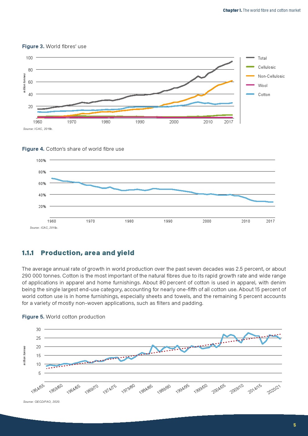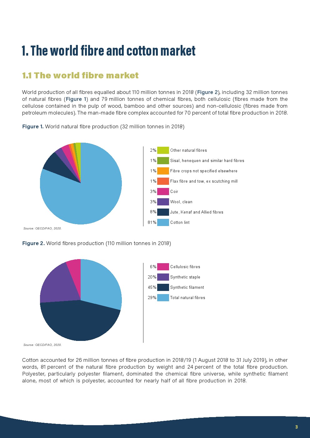 2018年世界所有纤维的产量约为1.1亿吨,其中包括3200万吨天然纤维和7900万吨化学纤维,均为纤维素(由木浆中所含的纤维素制成的纤维 、竹子和其他来源)和非纤维素(由石油分子制成的纤维)。2018年,人造纤维占纤维总产量的70%。