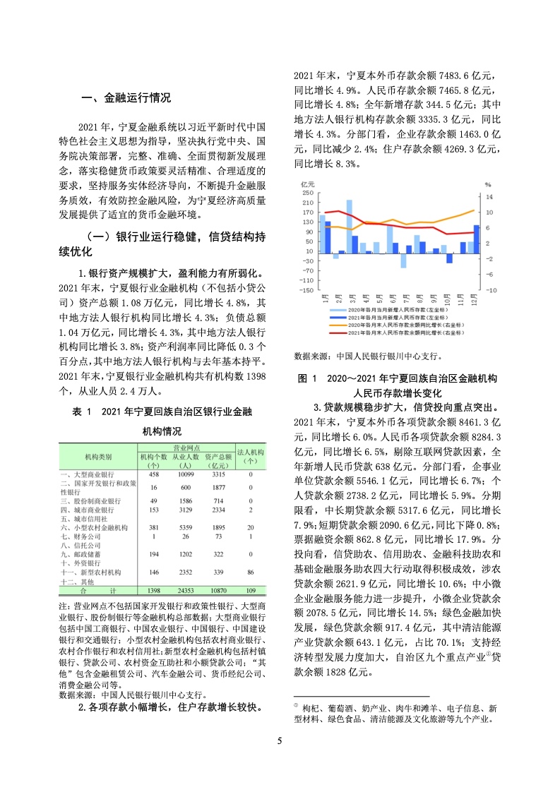 2021 年末,宁夏银行业金融机构(不包括小贷公 司)资产总额 1.08 万亿元,同比增长 4.8%,其 中地方法人银行机构同比增长 4.3%;负债总额 1.04 万亿元,同比增长 4.3%,其中地方法人银行 机构同比增长 3.8%;资产利润率同比降低 0.3 个 百分点,其中地方法人银行机构与去年基本持平。2021 年末,宁夏银行业金融机构共有机构数 1398 个,从业人员 2.4 万人。
