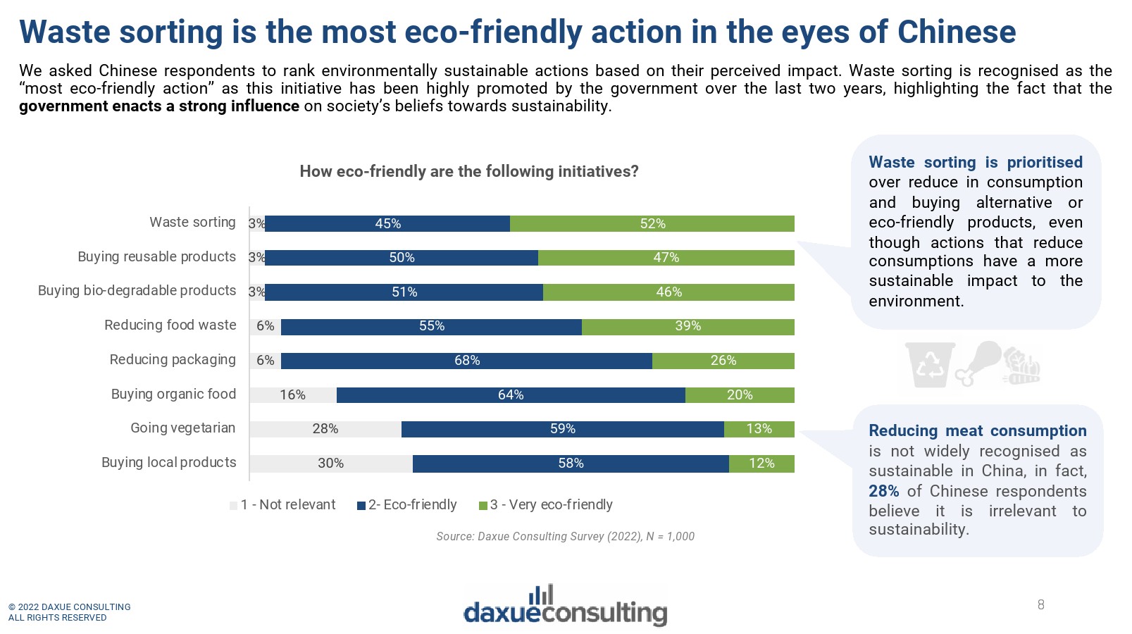 中国网民经常将可持续发展视为保护环境和减少碳排放的重要条件。调查发现,垃圾分类被中国消费者认为是最环保的行为。值得注意的是,28%的中国消费者认为肉类消费与可持续性无关。但是,事实上,全球粮食系统占全球所有人造温室气体的37%。
