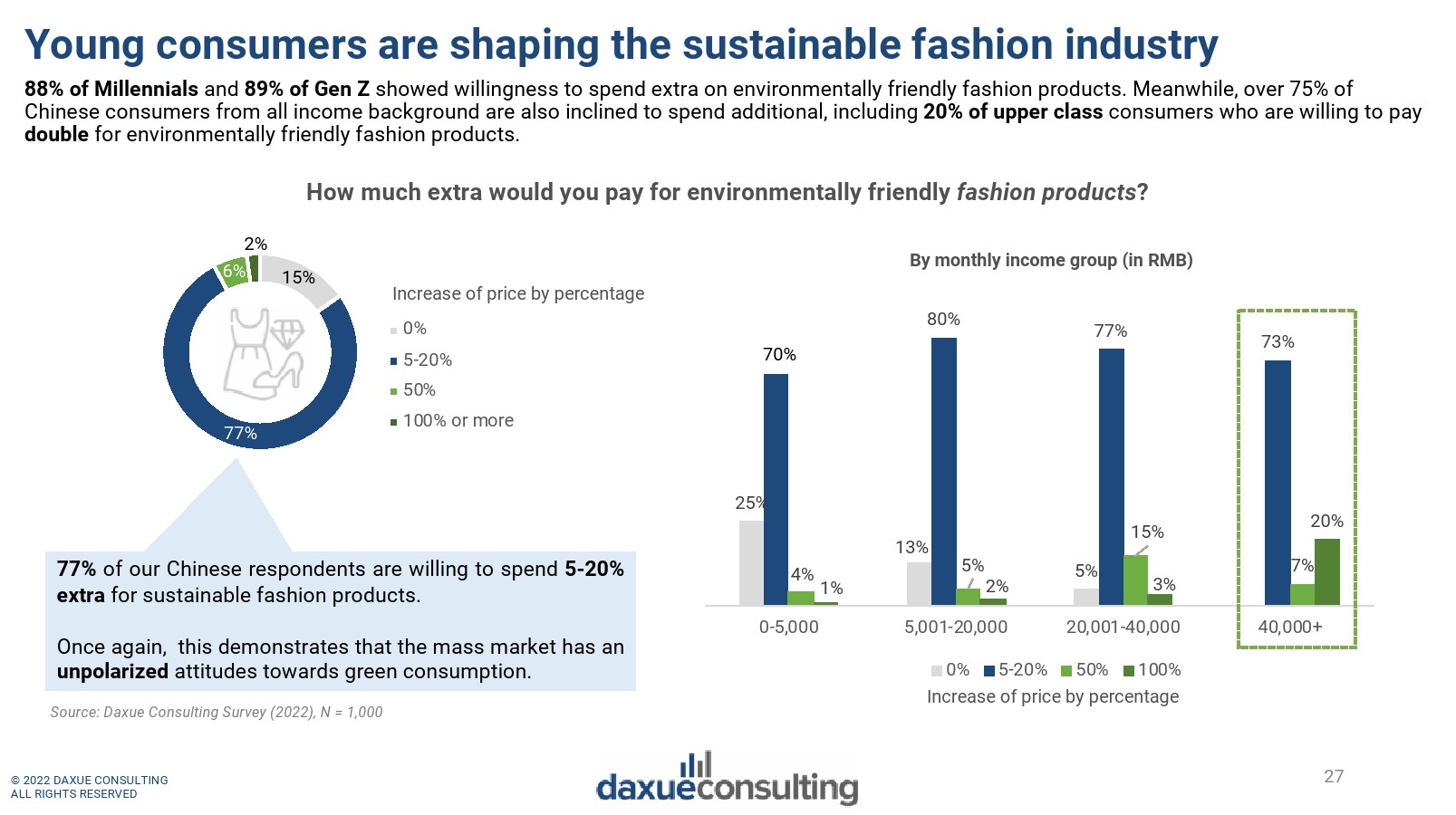 调查结果还显示,收入和教育背景较高的年轻中国消费者出于对可持续性的担忧,更倾向于改变他们的购买行为。