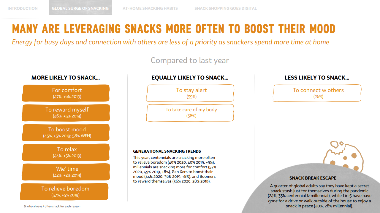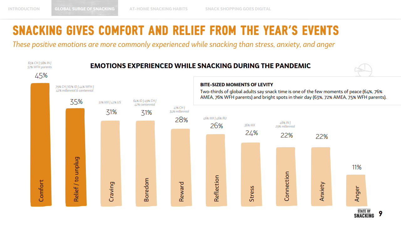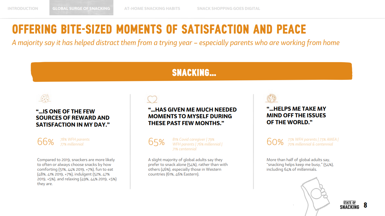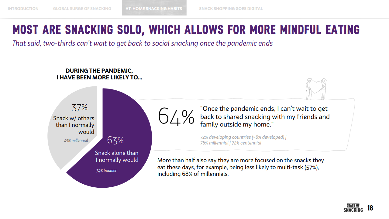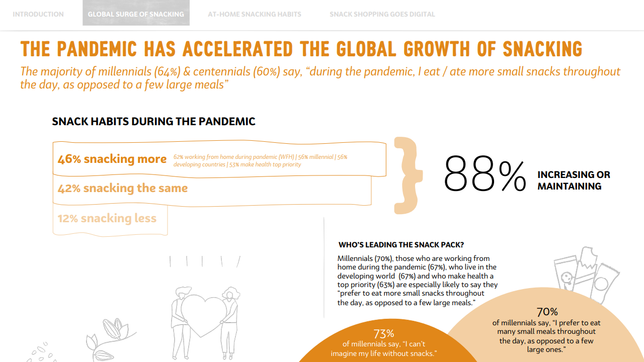 这意味着,疫情期间,年轻消费者养成的零食正餐化的这一习惯,对全球零食消费增长起到了至关重要的作用。