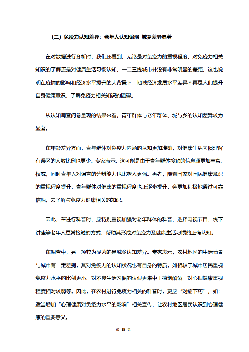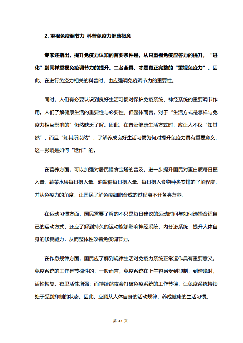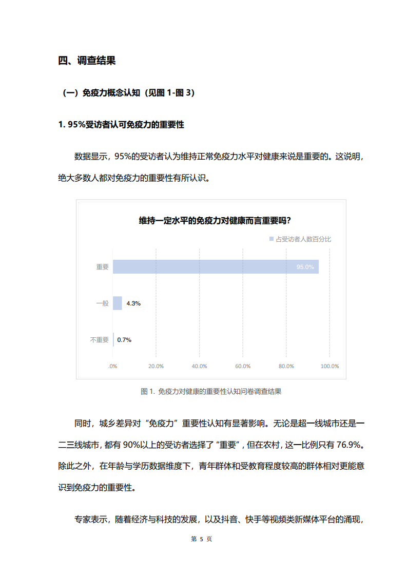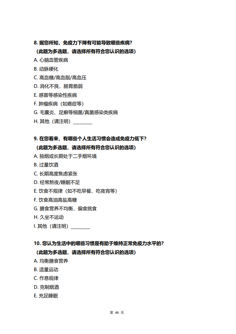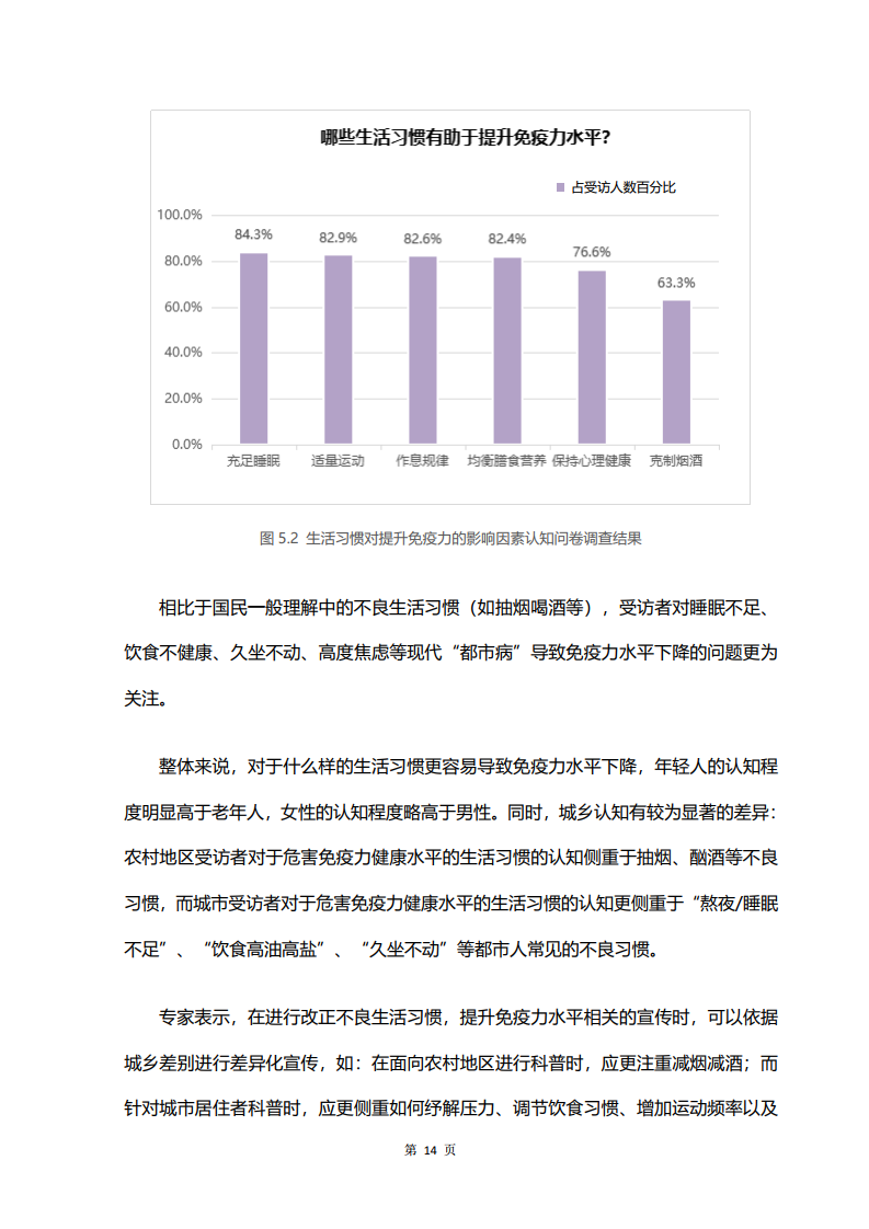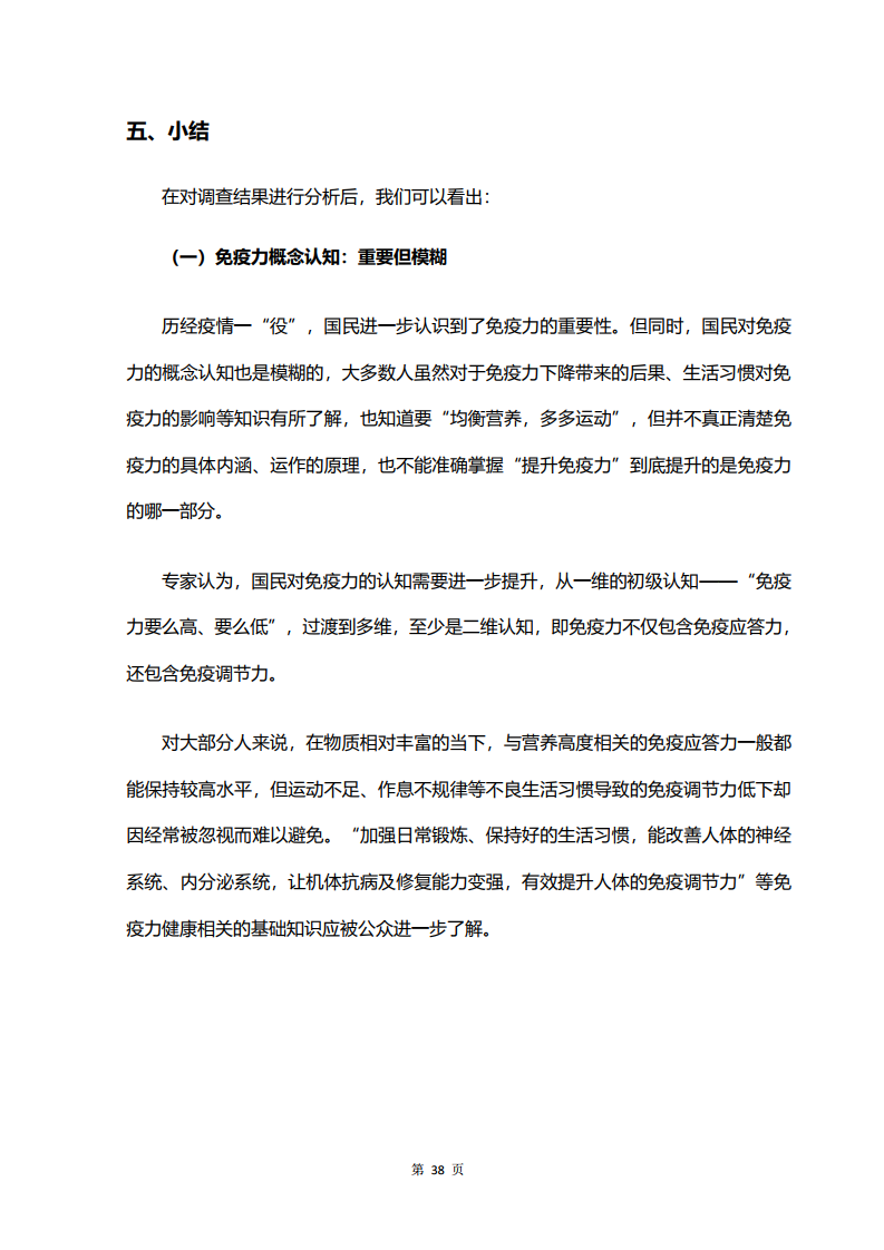 调查结果表明,95%的受访者认同免疫力对健康的重要性。整体来看,大部分受访者对什么是健康的饮食行为与健康的运动方式有所了解。但同时,国民对免疫力的具体概念和组成结构认知较为模糊,对免疫力的具体内涵缺乏准确的认识。另外,部分受访者对健康生活习惯也存在一定误区,比如认为“免疫力越高越好”“健康饮食就是减少碳水化合物的摄入” “每日一定要做中高强度的运动”“保健食品都是骗人的”等。