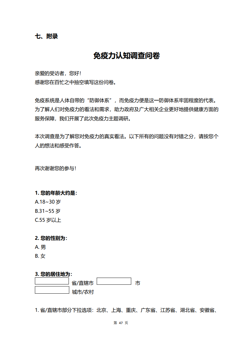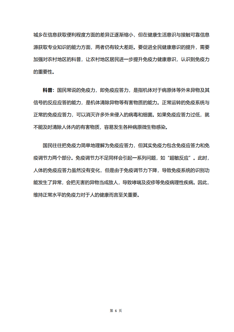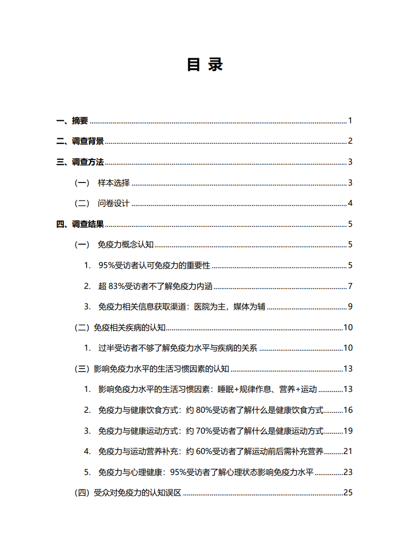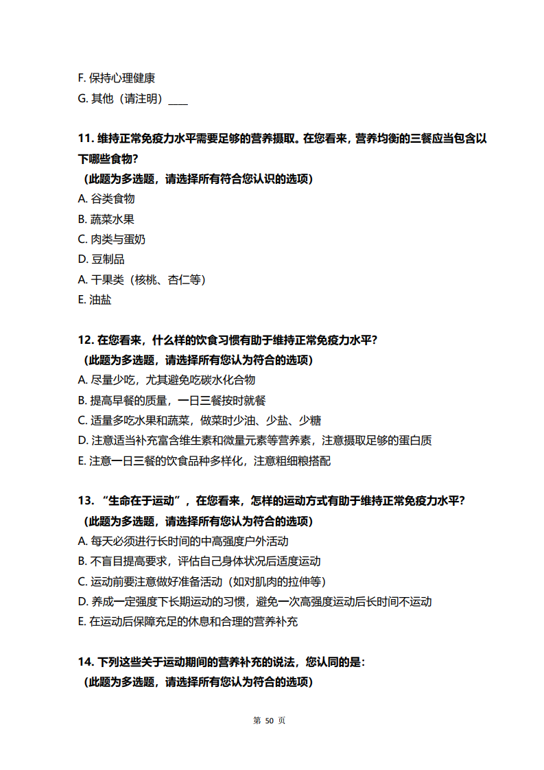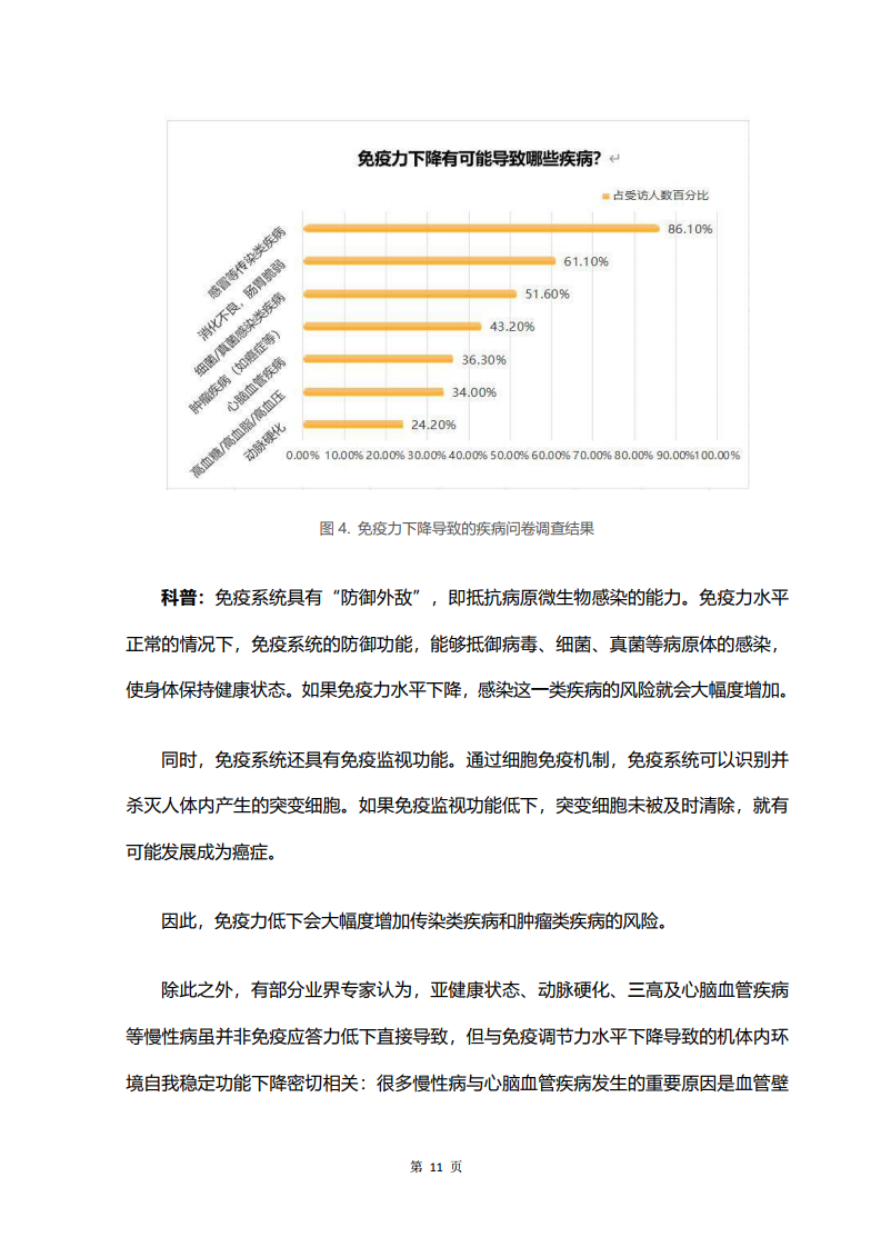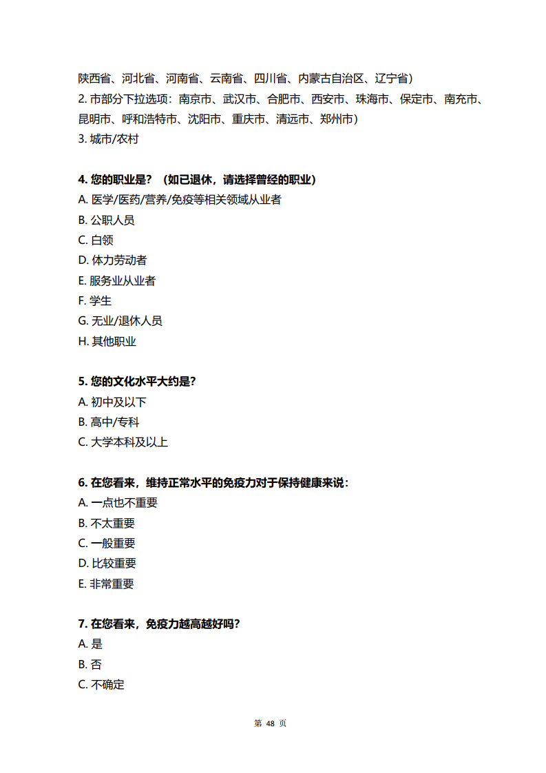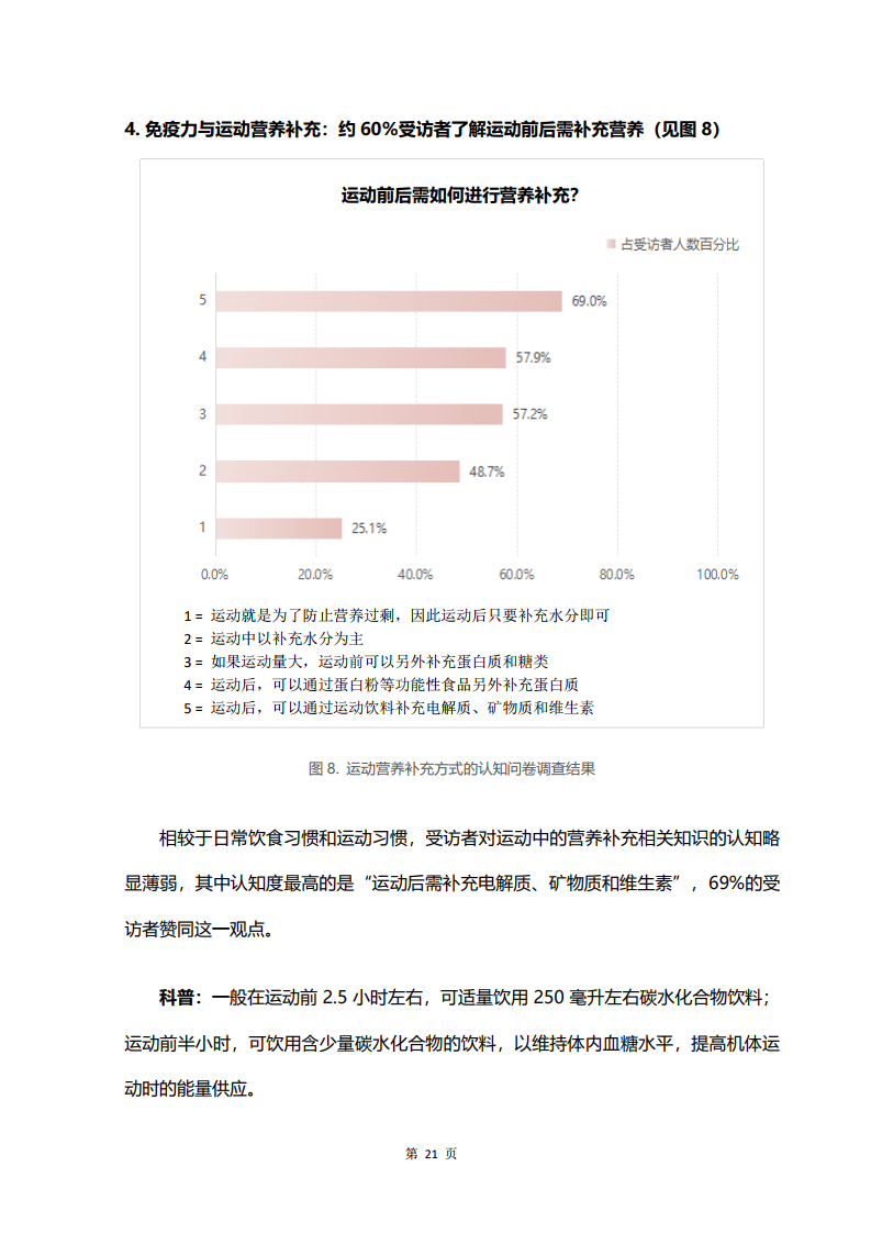 调查结果表明,95%的受访者认同免疫力对健康的重要性。整体来看,大部分受访者对什么是健康的饮食行为与健康的运动方式有所了解。但同时,国民对免疫力的具体概念和组成结构认知较为模糊,对免疫力的具体内涵缺乏准确的认识。另外,部分受访者对健康生活习惯也存在一定误区,比如认为“免疫力越高越好”“健康饮食就是减少碳水化合物的摄入” “每日一定要做中高强度的运动”“保健食品都是骗人的”等。