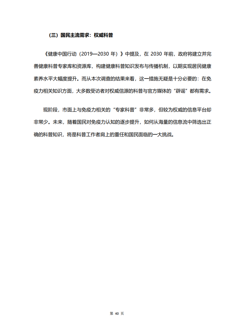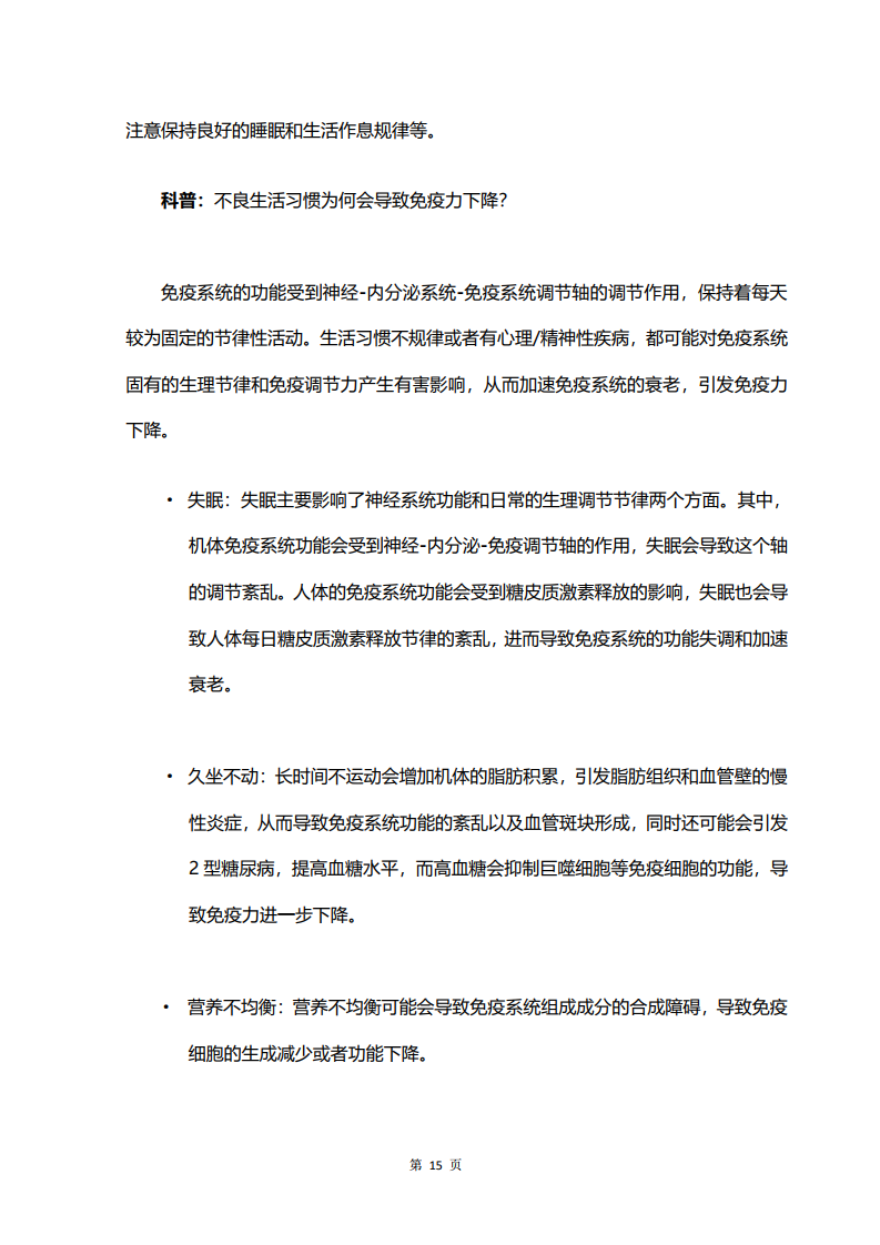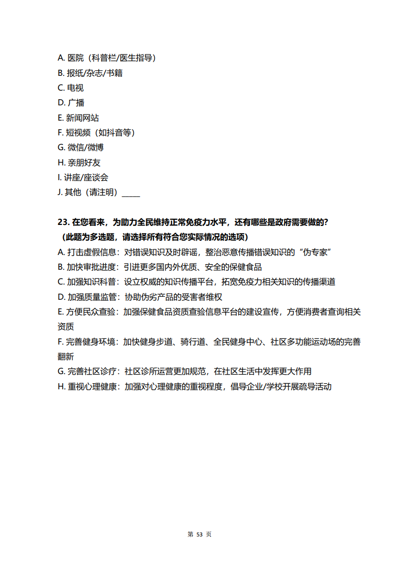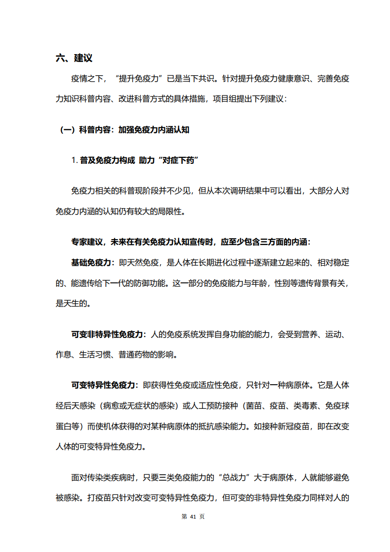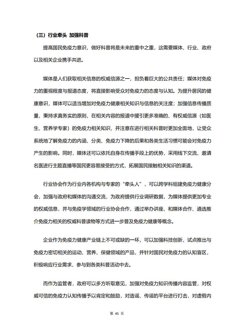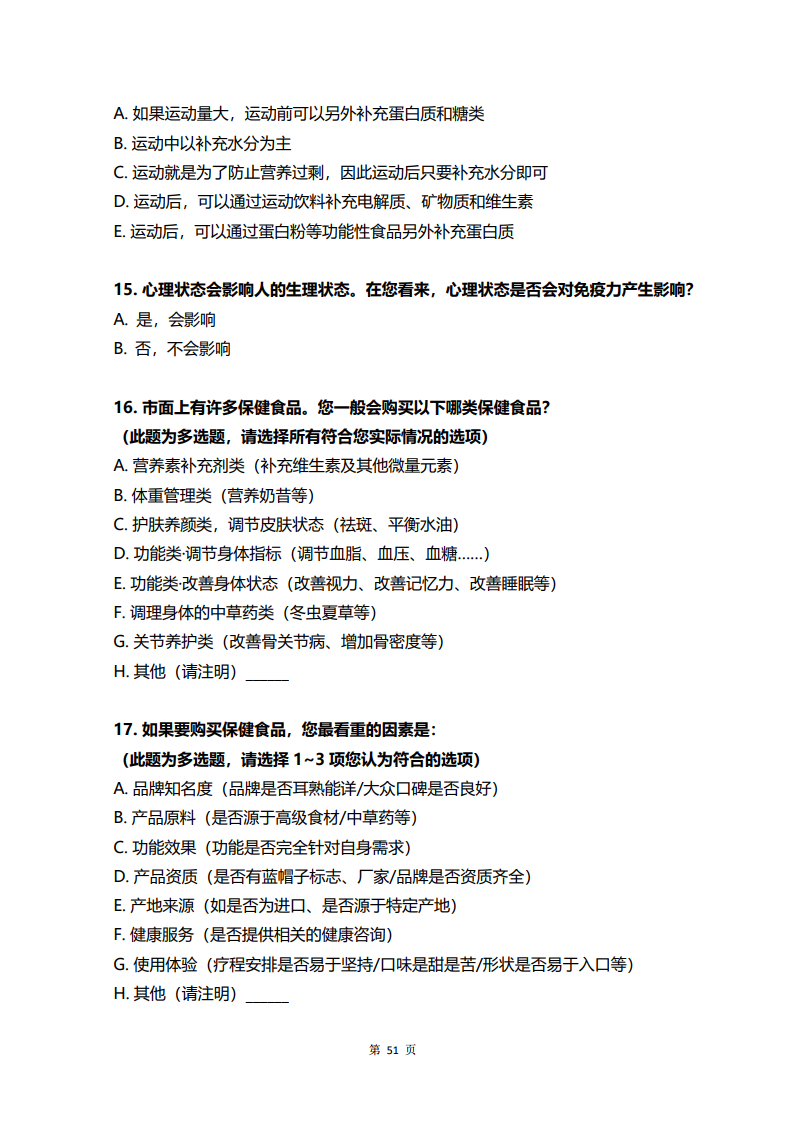 调查结果表明,95%的受访者认同免疫力对健康的重要性。整体来看,大部分受访者对什么是健康的饮食行为与健康的运动方式有所了解。但同时,国民对免疫力的具体概念和组成结构认知较为模糊,对免疫力的具体内涵缺乏准确的认识。另外,部分受访者对健康生活习惯也存在一定误区,比如认为“免疫力越高越好”“健康饮食就是减少碳水化合物的摄入” “每日一定要做中高强度的运动”“保健食品都是骗人的”等。