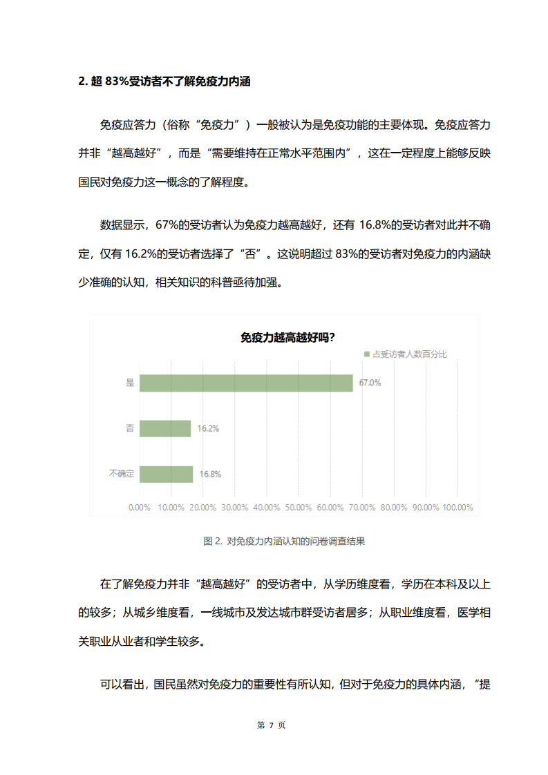 调研数据显示,67%的受访者认为“免疫力越高越好”,还有 16.8%的受访者对此并不确定。这说明超过 4/5 的受访者对免疫力的内涵缺少准确的认知,相关知识的科普亟待加强。