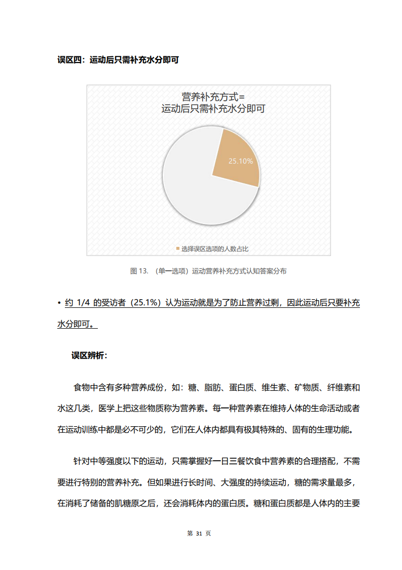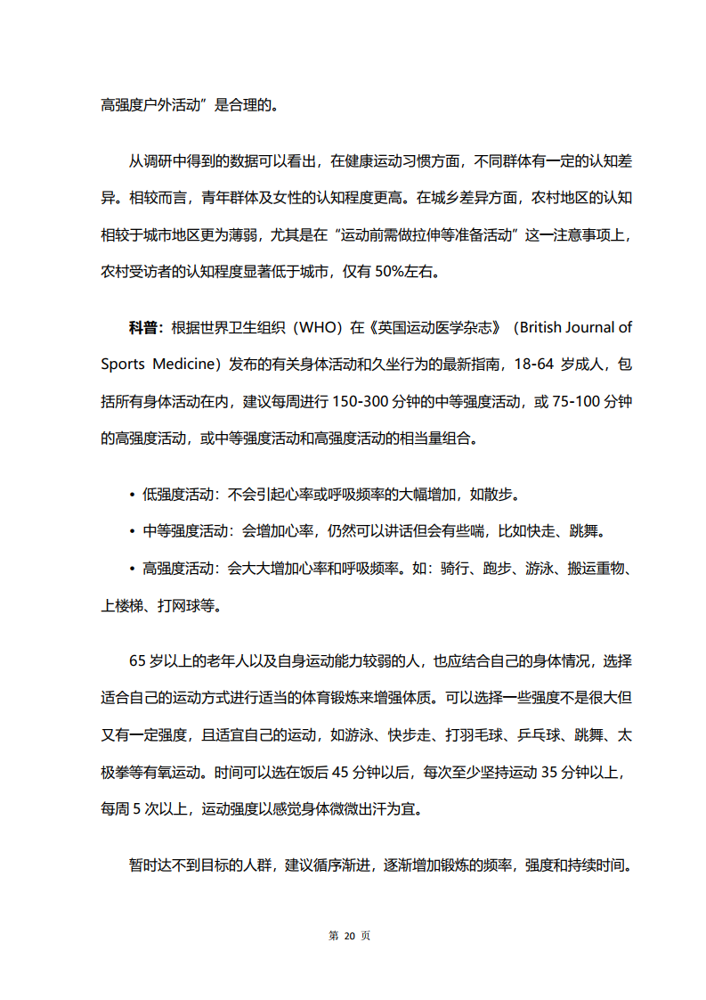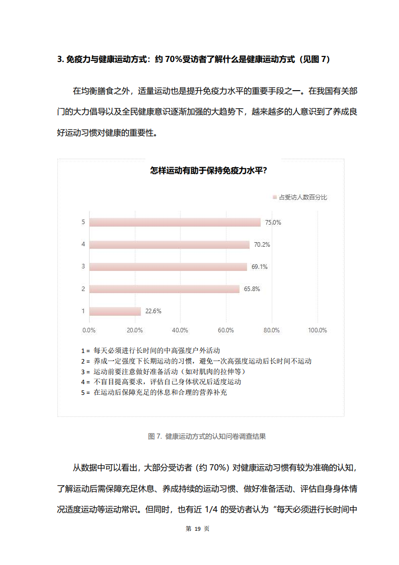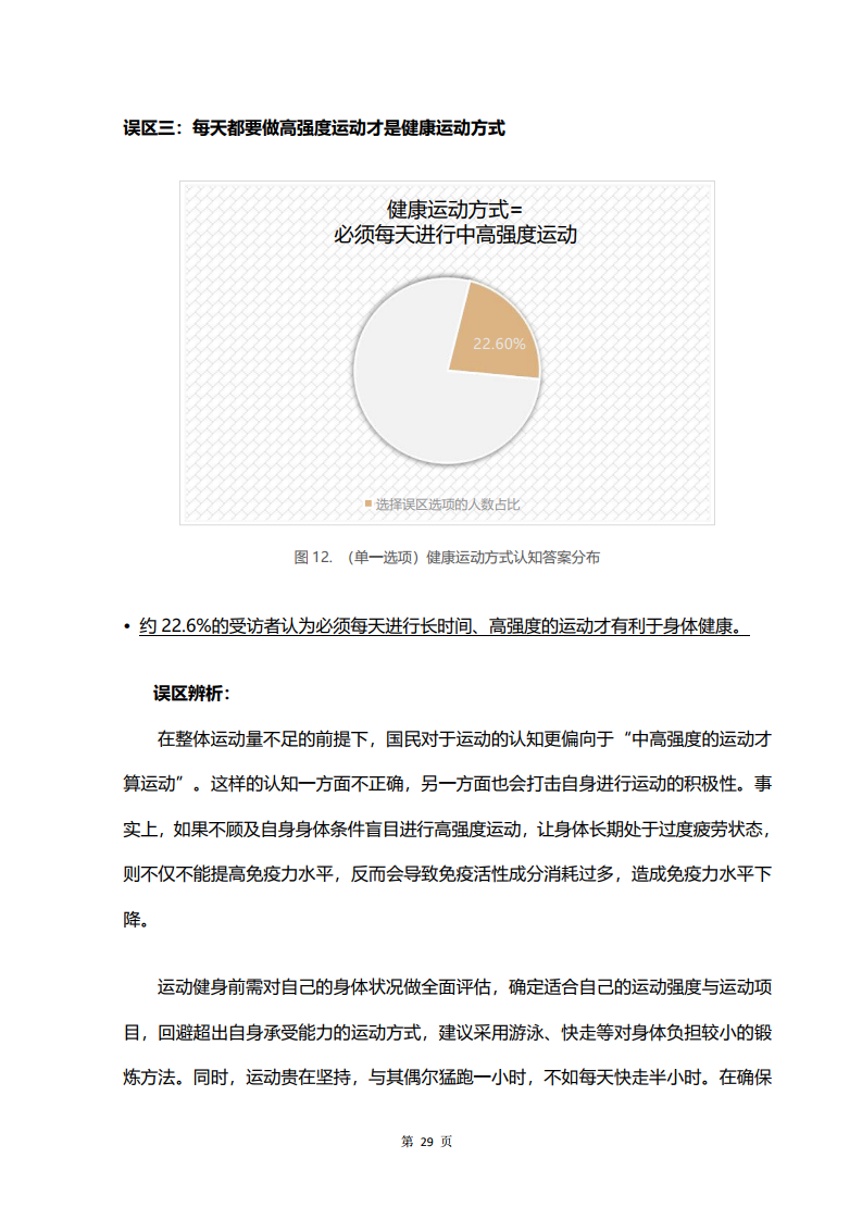 调研数据显示,约 22.6%的受访者认为必须每天进行长时间、高强度的运动才有利于身体健康,忽视了盲目进行高强度运动导致的过度疲劳,对于自身免疫力的负面作用。