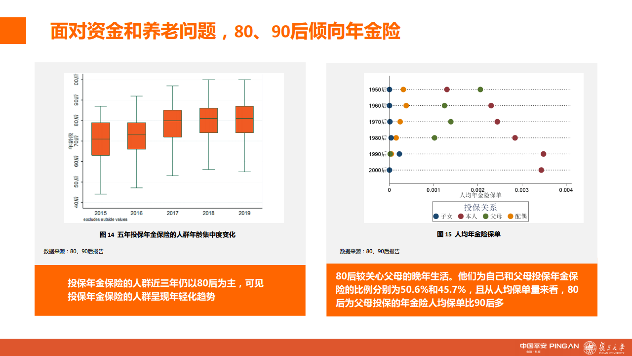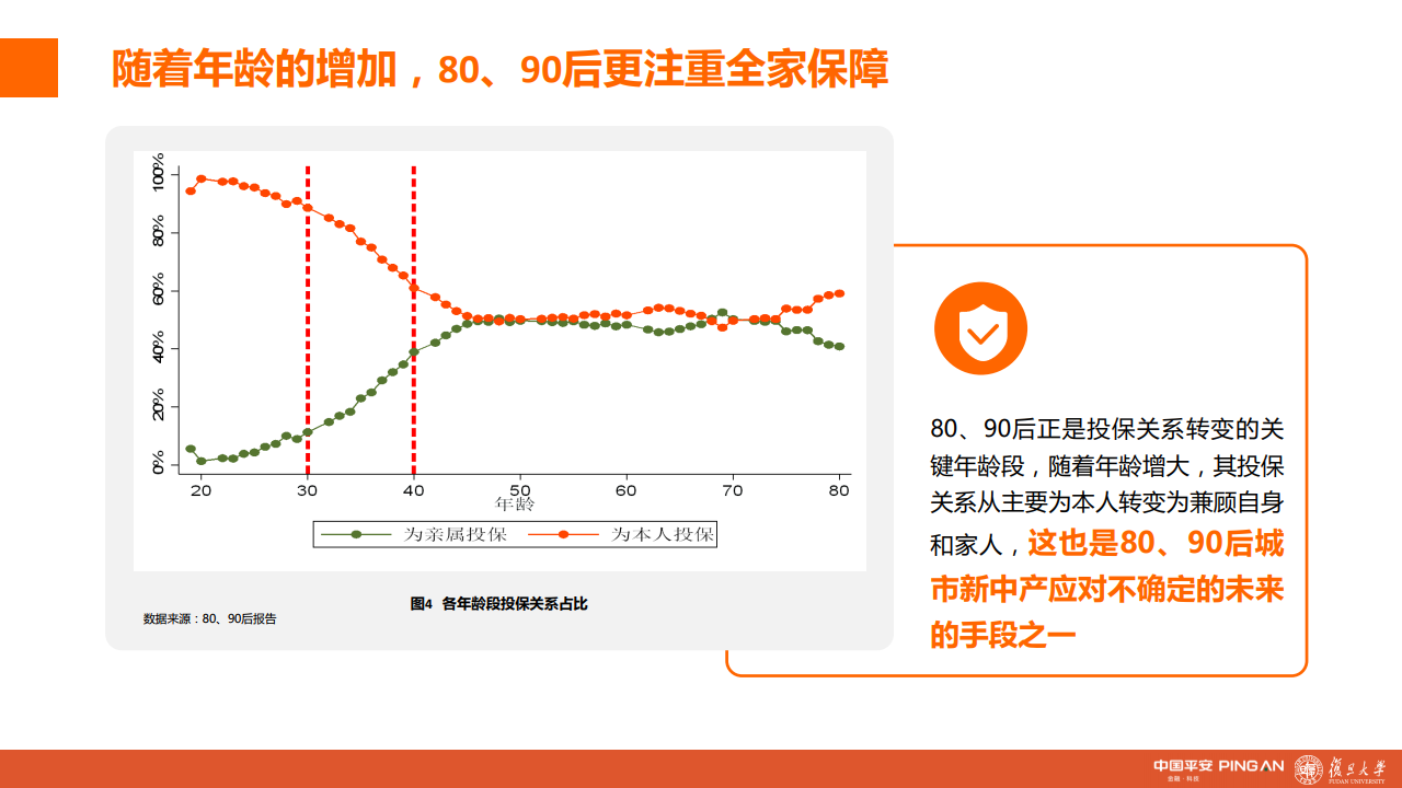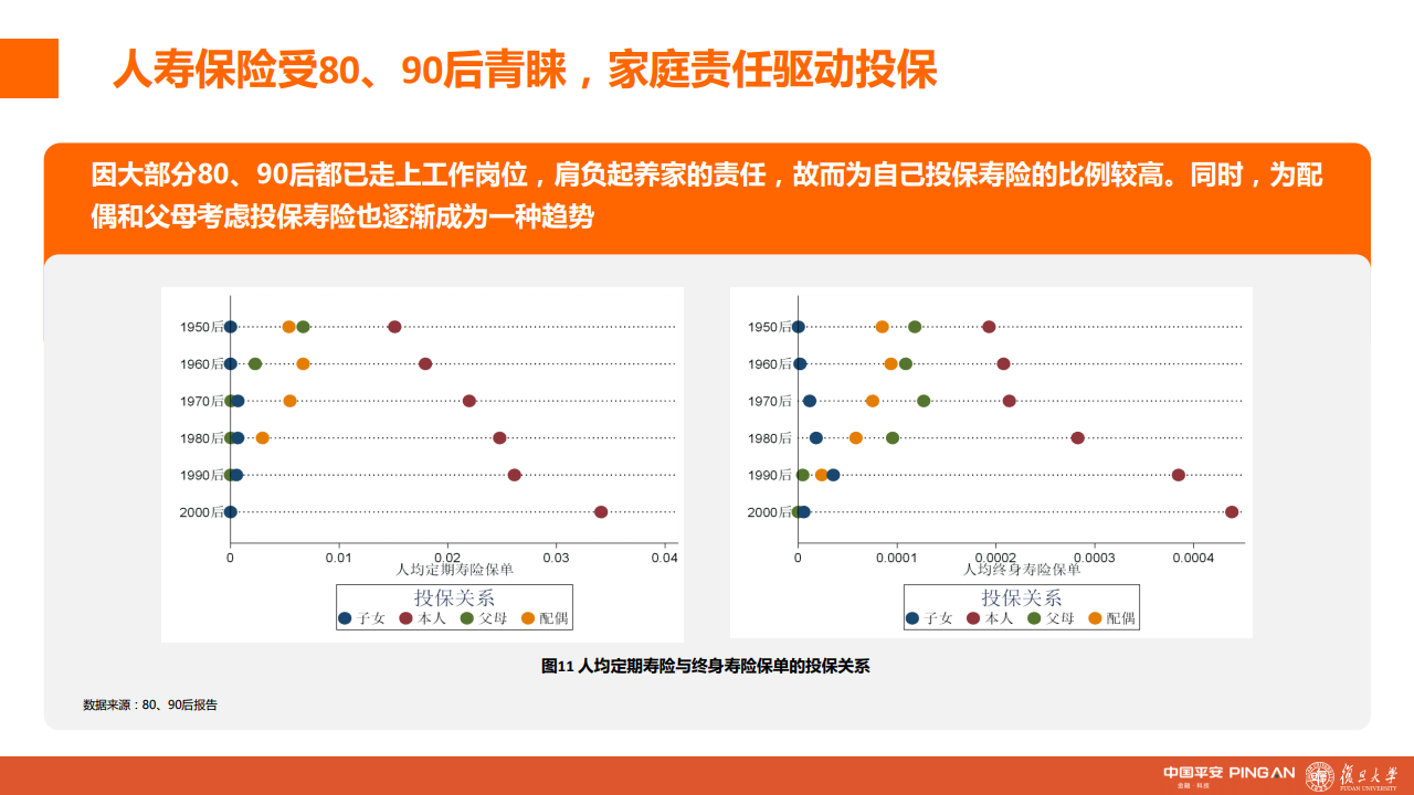 报告显示,除00后外,越年轻的群体持有的人均保单量越多,具体到险种上看,无论人寿保险、重疾险、意外险、年金险,主力消费者都向80后甚至90后倾斜。随着年龄的增加,80、90后不仅注重为自身投保,也更加关注全家保障。