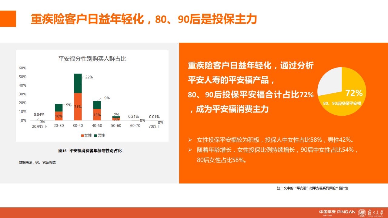 报告以平安人寿主力重疾产品“平安福”系列保险产品计划(下称“平安福”)的保单数据作为观测对象,结果显示,重疾险客户日益年轻化,80、90后投保“平安福”合计占比72%,成为“平安福”消费主力。而女性投保“平安福”更为积极,占比58%,且随着年龄增长,女性投保比例持续增长。