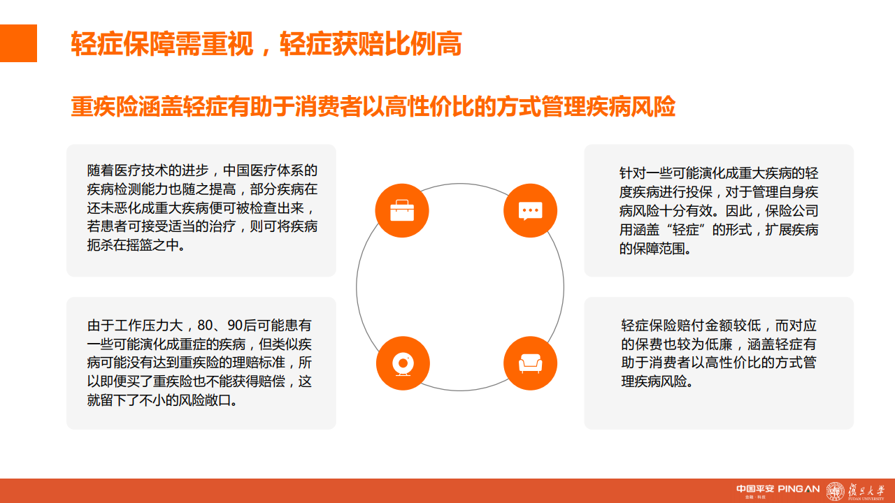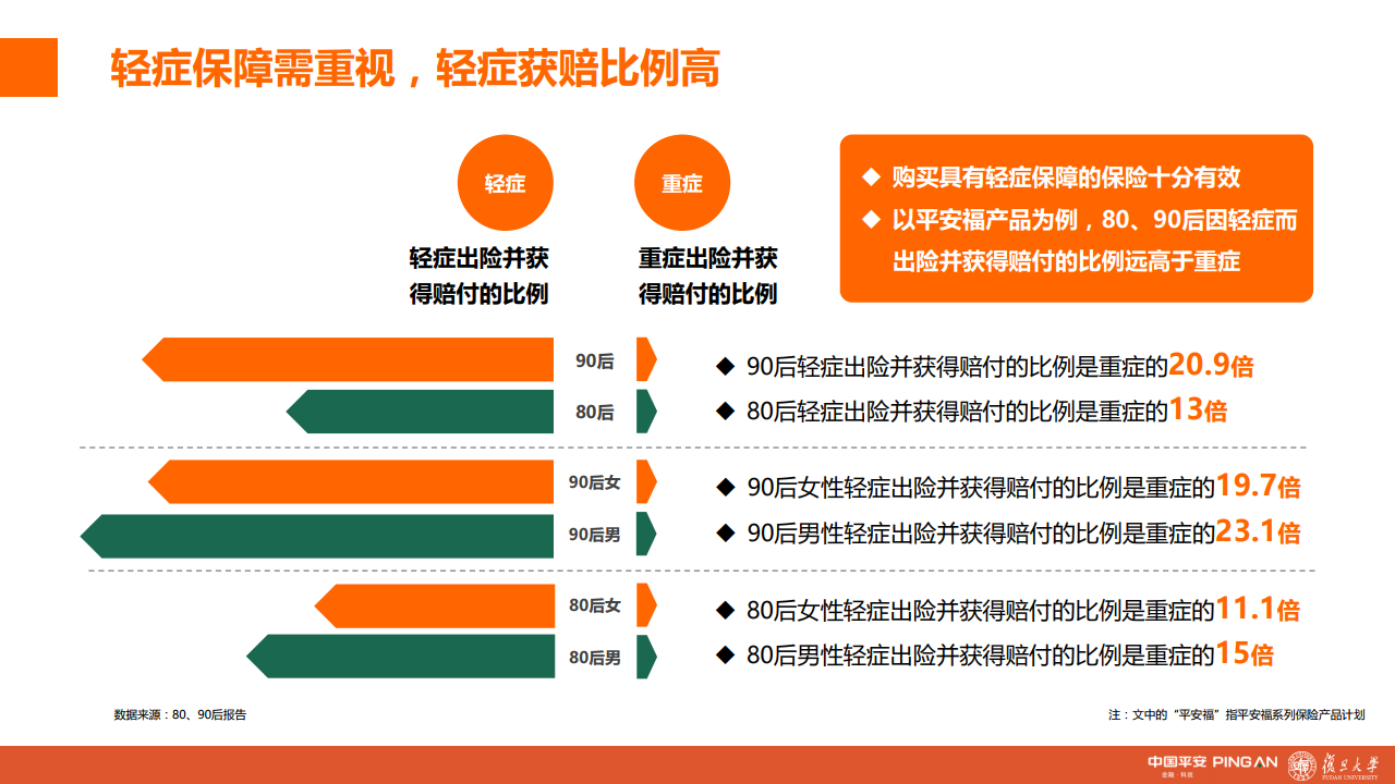 此外,轻症的保障也不容忽视。重疾险涵盖轻症更有助于消费者以高性价比的方式管理疾病风险,以“平安福”为例,80、90后因轻症而出险并获得赔付的比例远高于重症。90后轻症出险并获得赔付的比例是重症的20.9倍,80后轻症出险并获得赔付的比例则是重症的13倍。