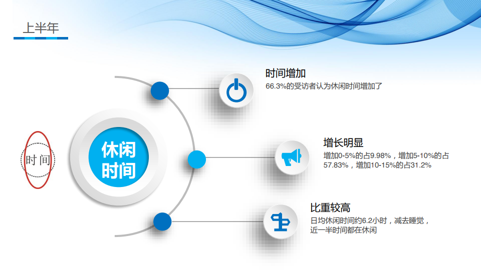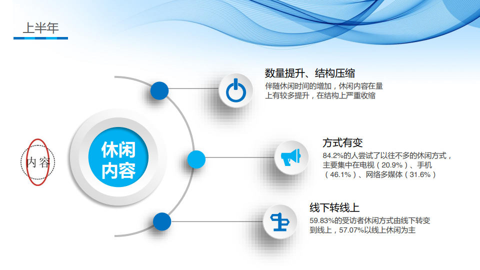 在疫情形势严峻的上半年,“宅家”成为了国民休闲的主要特征,衍生了十大热词:疫情、看电视、看手机、闲、宅、微信、家里蹲、浏览网站、吃了睡、云游。休闲内容呈现如下特征:伴随休闲时间的增加,休闲内容在量上有较多提升,在结构上严重收缩;惯常的休闲方式发生了变化,84.2%的人尝试了以往不多的休闲方式,主要集中在电视(20.9%)、手机(46.1%)、网络多媒体(31.6%);59.83%的受访者休闲方式由线下转变到线上,57.07%以线上休闲为主。休闲时间呈现如下特征:66.3%的受访者认为休闲时间增加了,增加0-5%的占9.98%,增加5-10%的占57.83%,增加10-15%的占31.2%;日均休闲时间约6.2小时,减去睡觉,近一半时间都在休闲。休闲空间呈现如下特征:63.34%的受访者认为休闲空间缩小了,缩小5-10%的占43.65%,缩小10-15%的占41.26%;平均休闲半径严重压缩,仅为1.8公里。