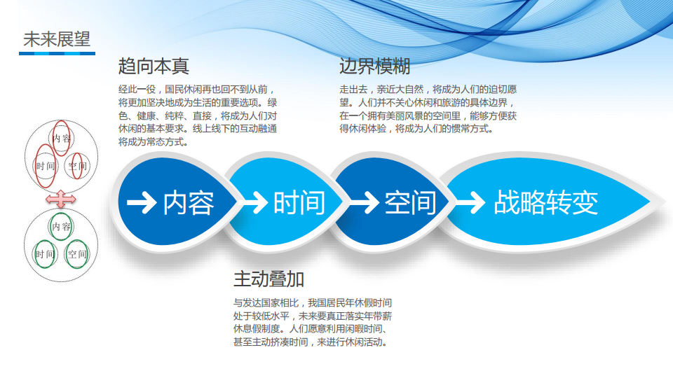 2020如果没来,国民休闲将平稳向好、稳步发展。大众旅游20年的快速、稳定和纵深发展,为国民休闲营造了坚实的产业氛围。休闲内容趋向多元,文化休闲比重不断提升,购物类、旅游类休闲仍是主要休闲方式。休闲时间在波动中理性增长,但相比较发达国家仍处于较低水平,平均每日休闲时间集中在3-5小时。休闲空间越来越远,休闲与旅游的边界变得模糊,2-3公里是主要休闲半径。国民休闲整体上呈现出与大众旅游相匹配的发展趋势,平稳向好、有序发展,但休闲供给与需求匹配度不高、城乡休闲的二元特征突出、休闲时间不足仍是主要制约因素。