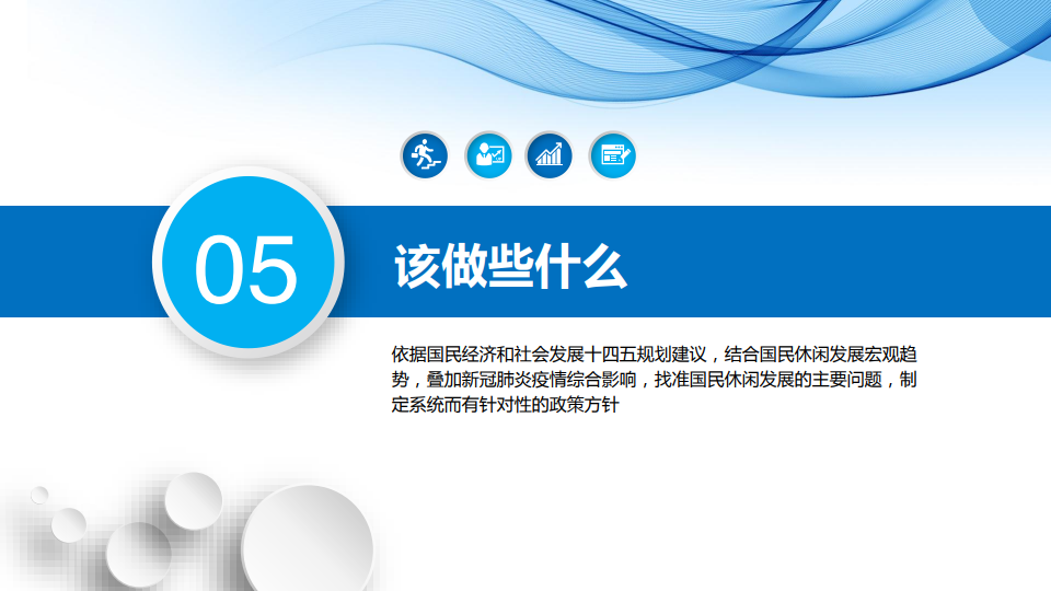 该做些什么?化繁为简地找准主要问题,制定有针对性的政策抓手。休闲内容的主要问题是供需匹配度不高,供给体系存在规模不足、结构失衡现象,导致供给效能较低。应贯彻落实党的“十九届五中全会”精神,以建设世界级旅游度假区、国家级休闲城市和休闲街区为契机,深入开展居民休闲需求研究,引领供给休闲供给产品体系;休闲时间的主要问题是有效休闲时间不足。应修订完善《国民休闲刚要》,真正落实年带薪休假制度,创新休闲业态,发展夜间休闲、美食休闲等新兴业态,激发居民闲暇时间的休闲转化;休闲空间的主要问题是城乡休闲空间的两张皮现象突出,城市休闲过于注重精英主义,农村休闲模式当地居民的休闲权益。应发展共享理念,指导国民休闲发展,统一规划建设,以“共”统领供给,做好细分研判,以“享”满足需求,大力推进城乡共享休闲空间的营造。