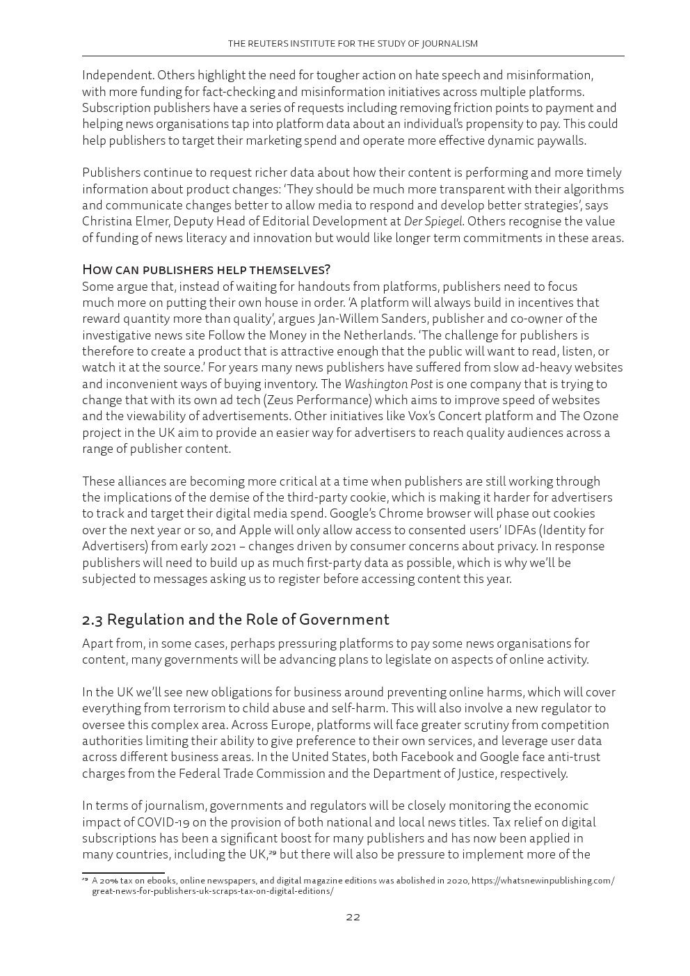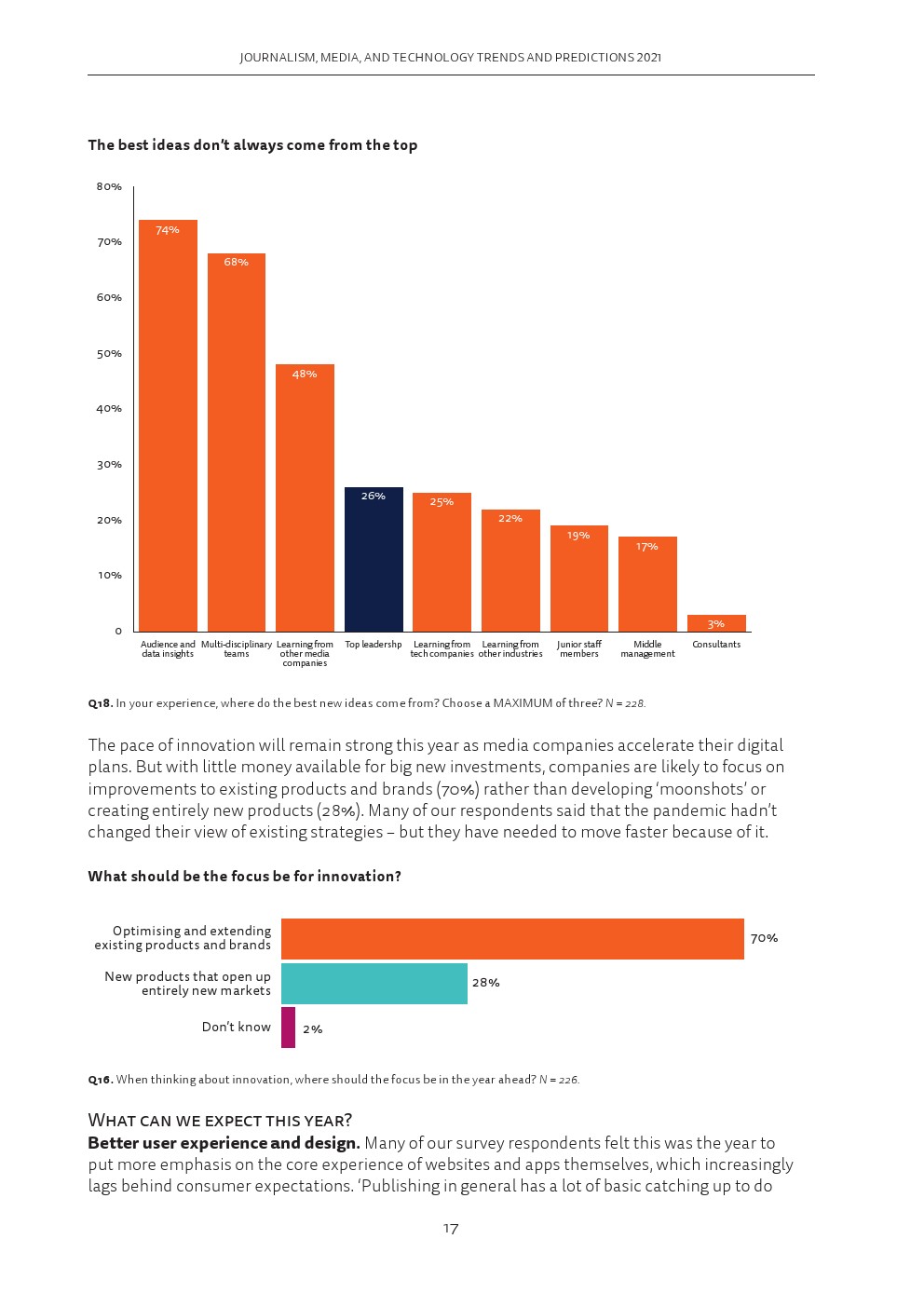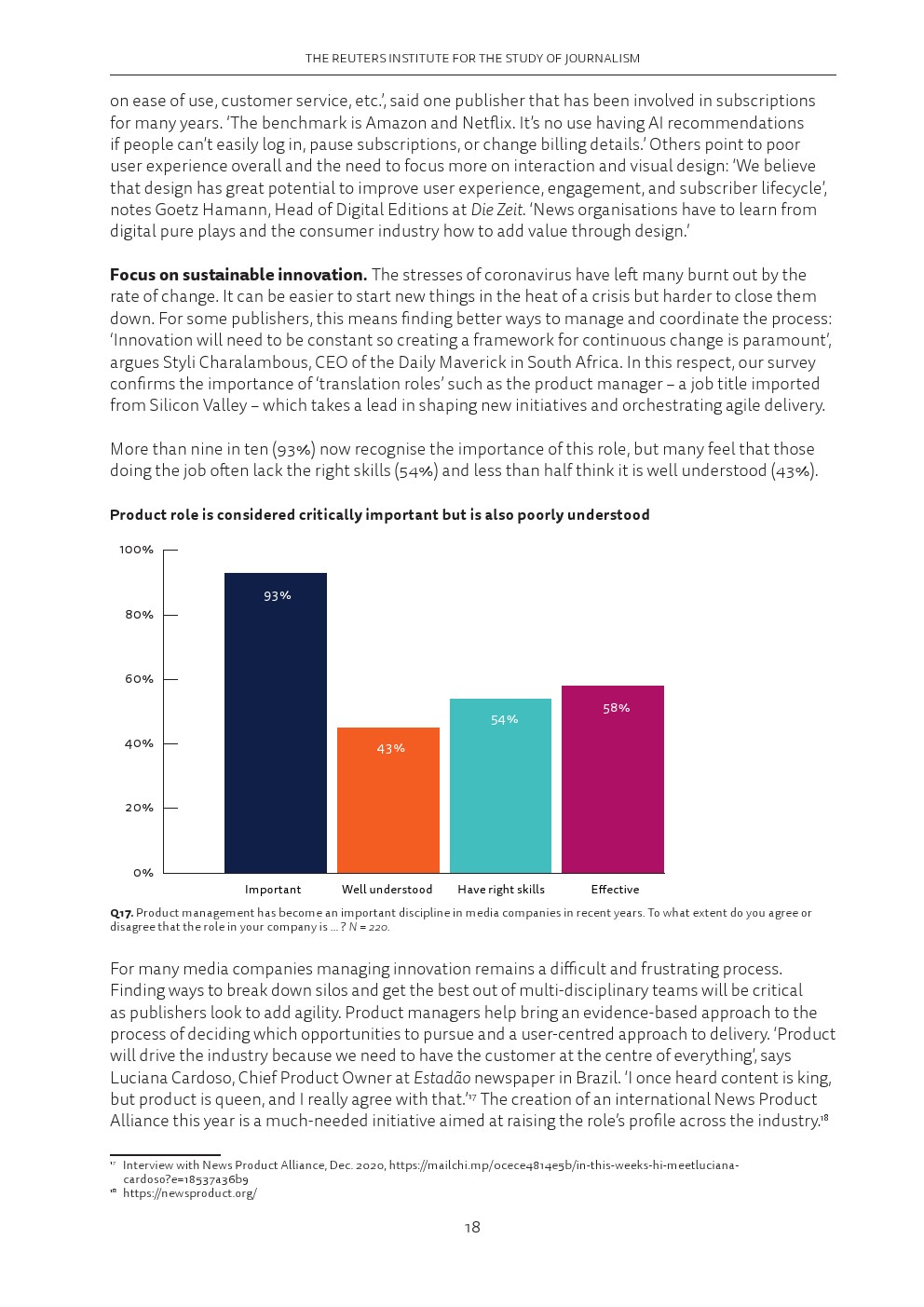76%的编辑、首席执行官和网络媒体领袖表示,新冠肺炎已经加快了他们的数字化转型计划。76%的受访者认为推动数字订阅是一个重要或非常重要的收入源,领先于展示广告和原生广告。总体而言,大多数受访者(73%)对自己公司未来一年的前景充满信心,但对新闻业未来充满信心的人较少(53%)。出版商似乎比去年这个时候对政府的支持更有信心了。36%的受访者认为政策干预可能会有所帮助。47%的受访者认为干预不会有什么不同,另有17%的受访者表示他们可能会让事情变得更糟。大约一半(48%)的受访者认为只有一小部分“高质量”的新闻机构应该拿到钱,32%的受访者更喜欢基于使用量的系统。发布商还认为科技和社交媒体平台可以支持新闻业。根据调查,受众和数据洞察力(74%)、多学科团队(68%)以及向其他媒体公司学习(48%)被认为是产生新想法的最佳方式,而最高领导层的这一比例仅为26%。93%的受访者表示产品经理在协调和塑造数字创新方面发挥着关键作用,但不到一半(43%)的人表示他们的公司很好地理解了这一点。69%的受访者表示,人工智能技术将在未来五年内对新闻业产生最大影响,领先于5G(18%)和新设备(9%)。