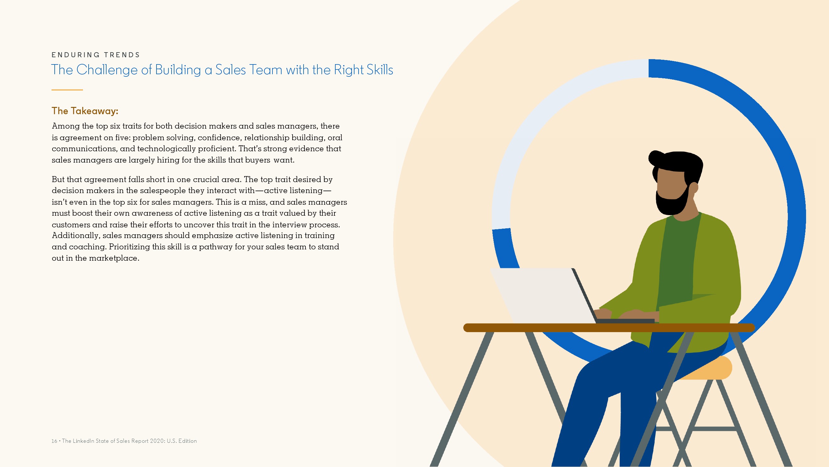 在对500多名买家和500名销售人员的调查中,积极倾听被认为是销售人员最重要的品质(42%),解决问题的能力排名第二(38%)。其他顶级特质包括自信(38%)、建立关系(34%)和口头交流能力(27%)。