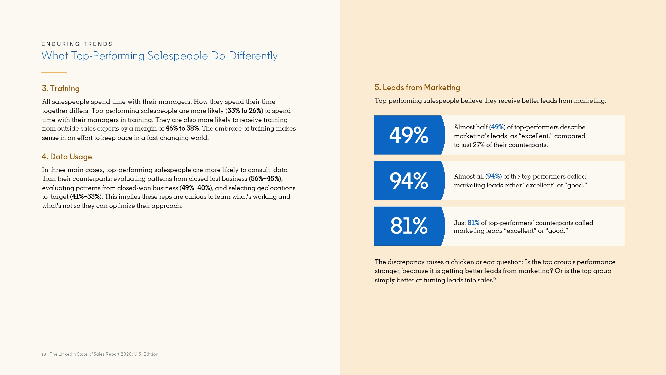 表现最好的销售人员更有可能把时间花在培训上(33%比26%),也更有可能接受外部销售专家的培训(46%比38%)。