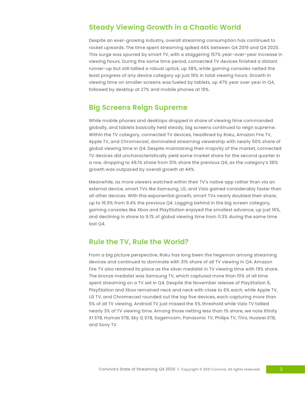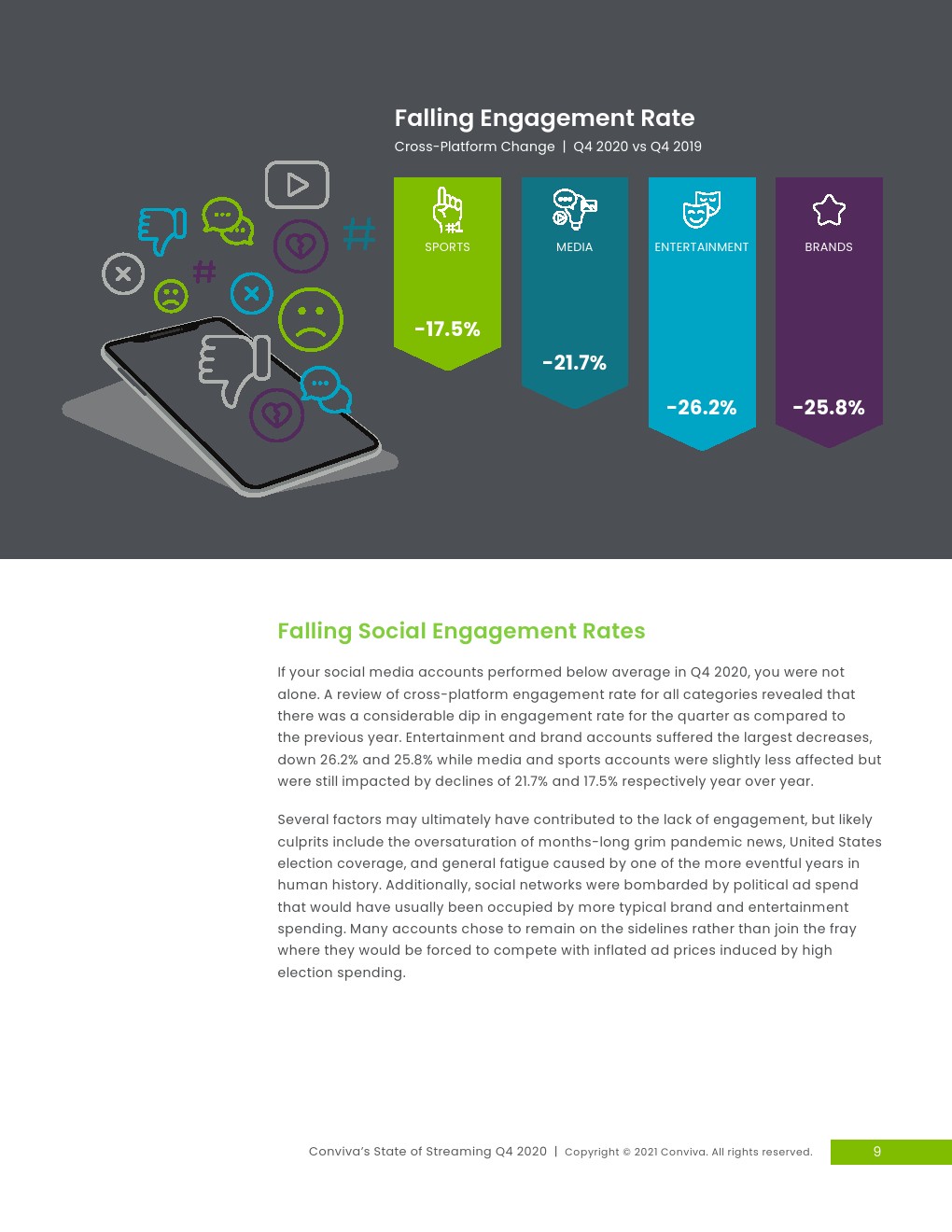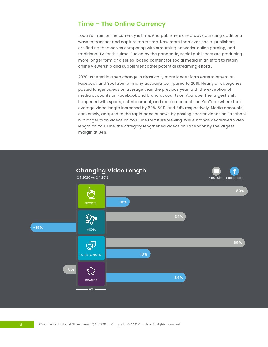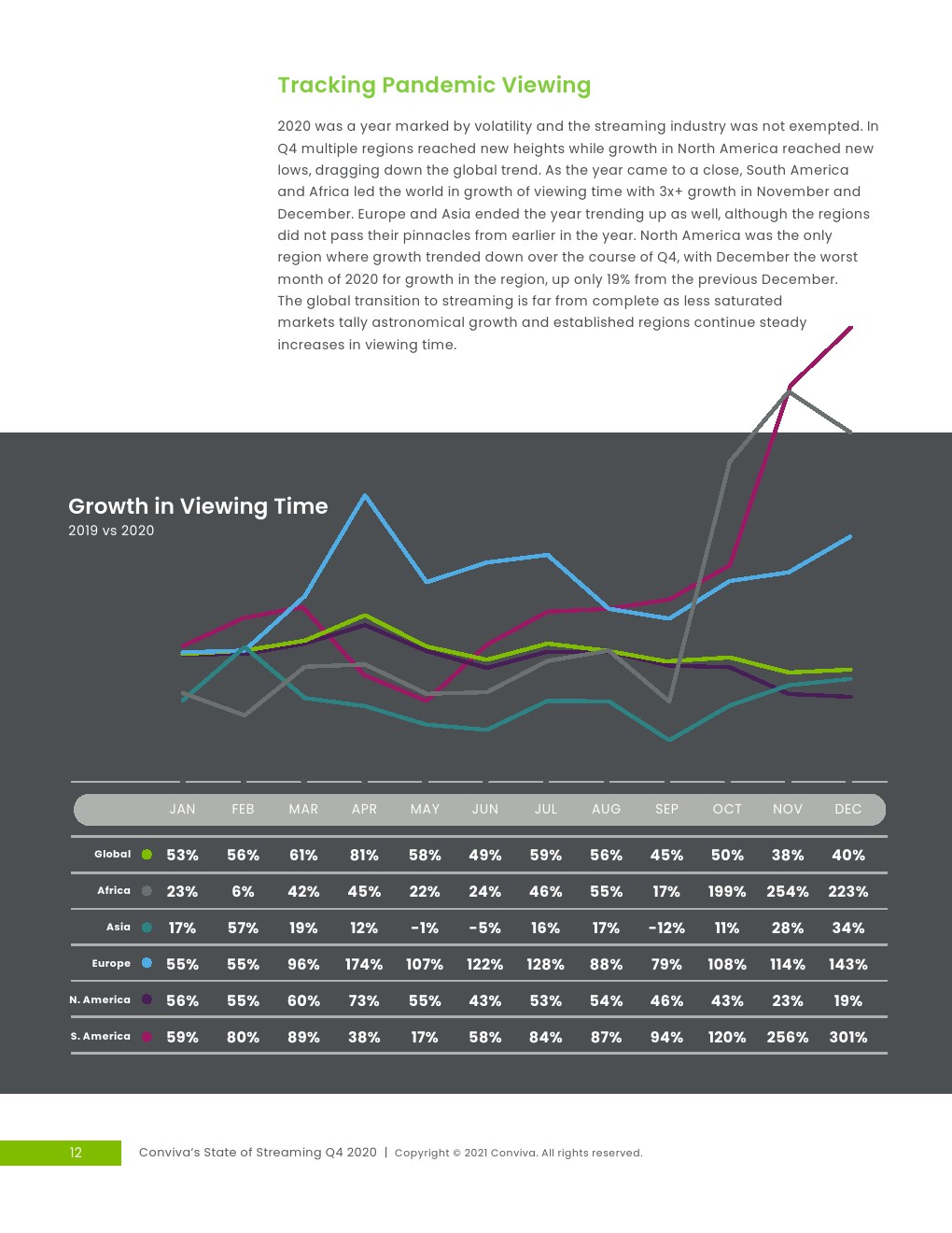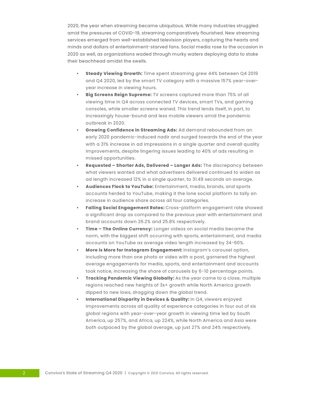 稳定的收视增长:2019年第四季度至2020年第四季度,流媒体观看时间增长了44%,智能电视领跑,观看时长同比大幅增长157%。大屏幕:第四季度,联网电视设备、智能电视和游戏机上的电视观看时间占总使用时间的75%以上,而较小的屏幕上的收看时间份额则逐渐减少。对流媒体广告的信心不断增强:广告需求从2020年初大流行引发的最低点反弹,并在接近年底时飙升,单季度广告展现量增长了31%。整体质量也有所改善,尽管挥之不去的问题导致40%的广告未被人类收看。点播更短的广告,交付更长的广告:广告时长在一个季度增长12%,达到平均31.49秒。观众涌向YouTube:娱乐、媒体、品牌和体育账户统统涌向YouTube,使其成为唯一一个在所有四个类别的观众份额都有所增加的社交平台。社交参与率下降:与去年相比,跨平台参与率明显下降,娱乐账户和品牌账户分别下降了26.2%和25.8%。时间-网络货币:社交媒体上更长的视频成为常态,最大的变化发生在YouTube上的体育、娱乐和媒体频到上,平均视频长度增长了34%-60%。设备和质量的区域差距:第四季度,全球6个地区中有4个的观众享受到了所有体验质量的改善,观看时间同比增长最快的是南美,增长257%,非洲增长224%,而北美和亚洲的增长速度都超过了全球平均水平,分别仅增长27%和24%。