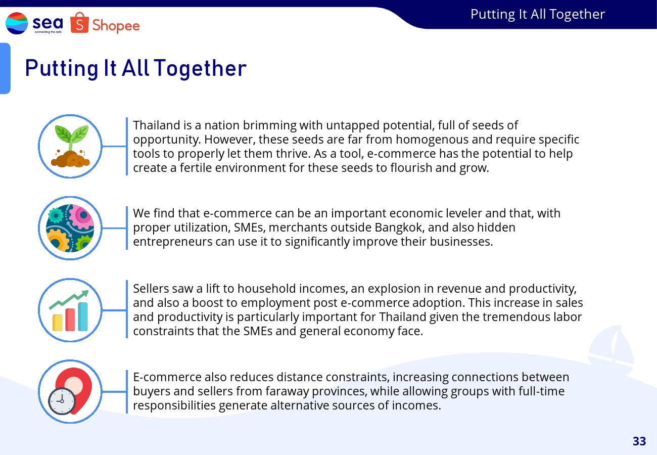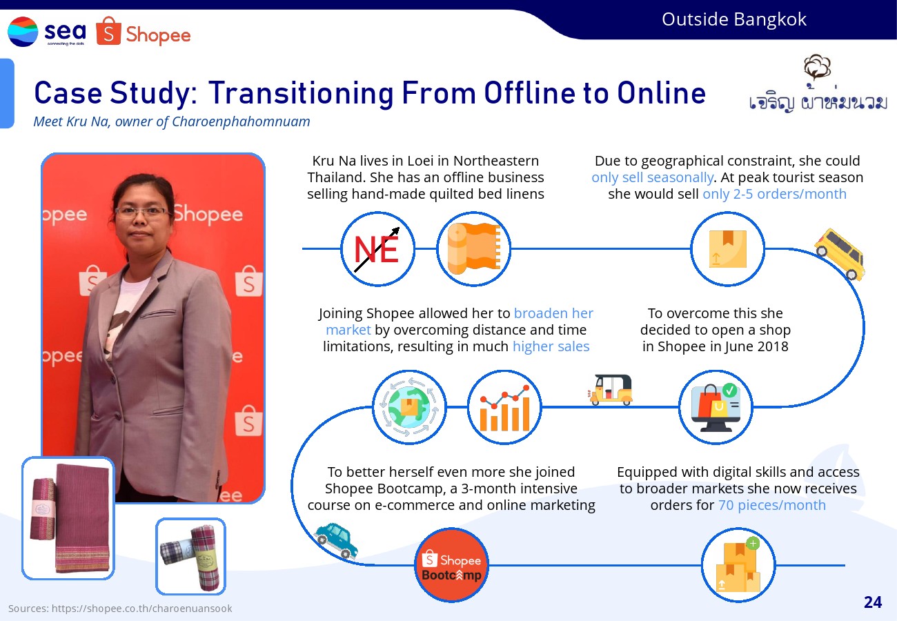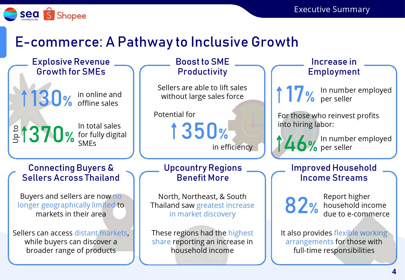 研究表明,电子商务可以通过发现中小企业、曼谷以外的商人以及隐藏的企业家等尚未开发潜力的群体来实现促进包容性增长的一种方式。