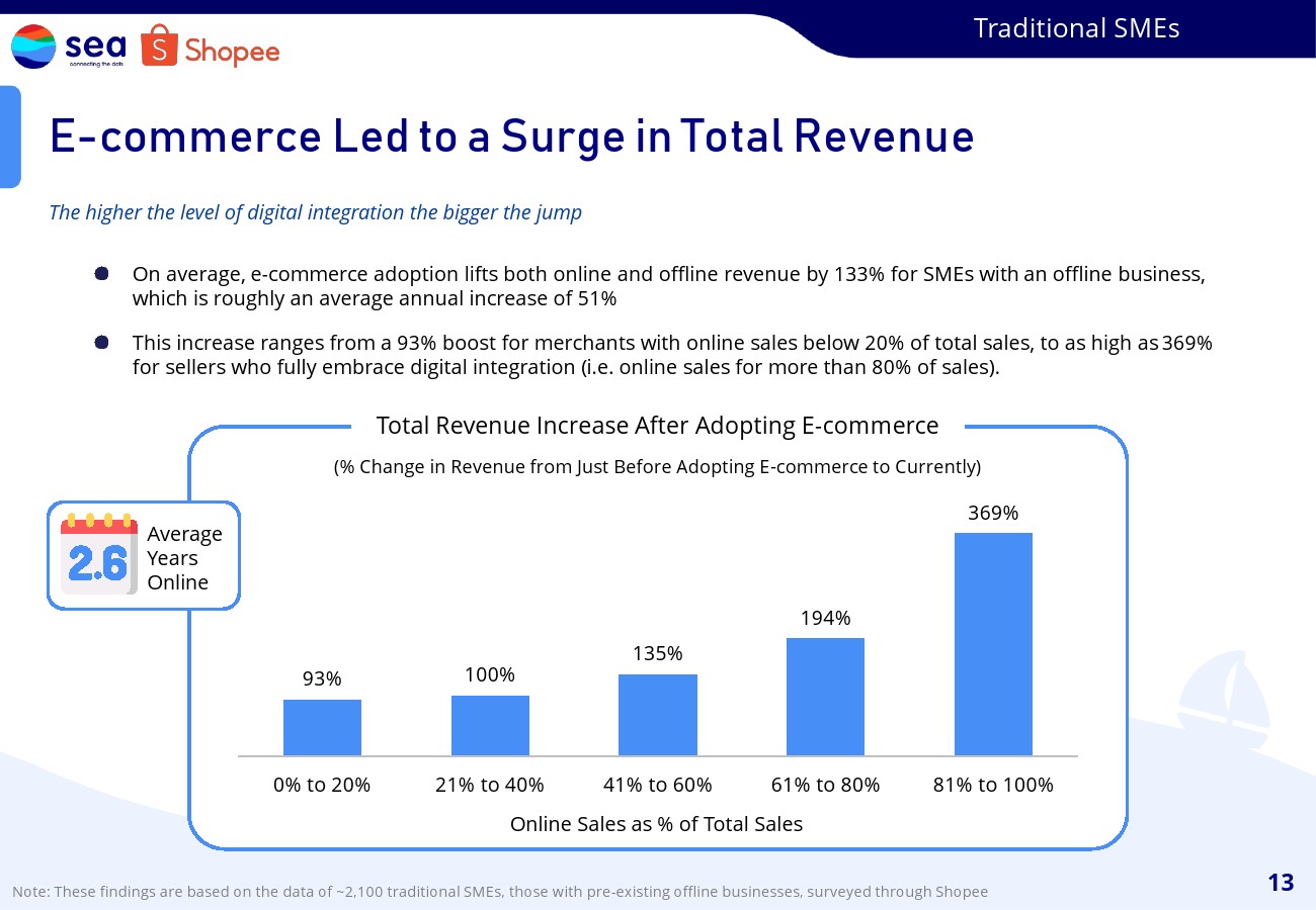 我们发现,采用电子商务平均为中小企业提高了133%的收入。对于那些完全接受数字集成的商家(即在线销售占总销售额的80%以上)来说,这一增长可能高达369%。