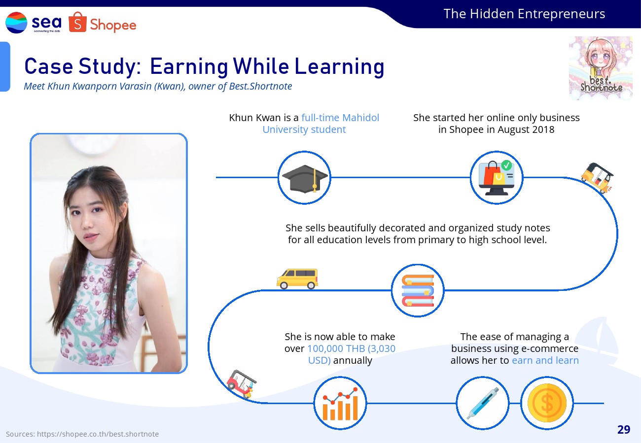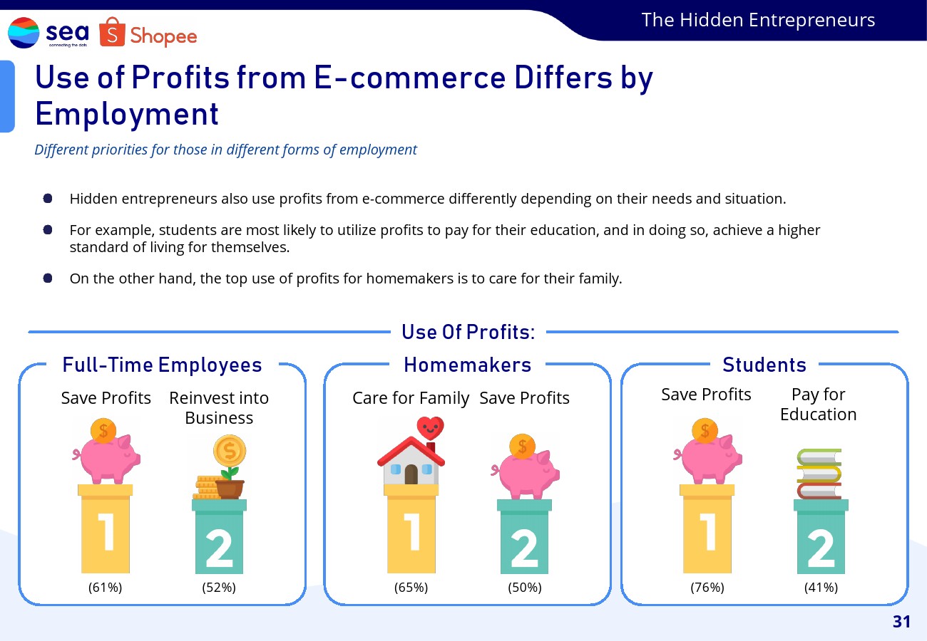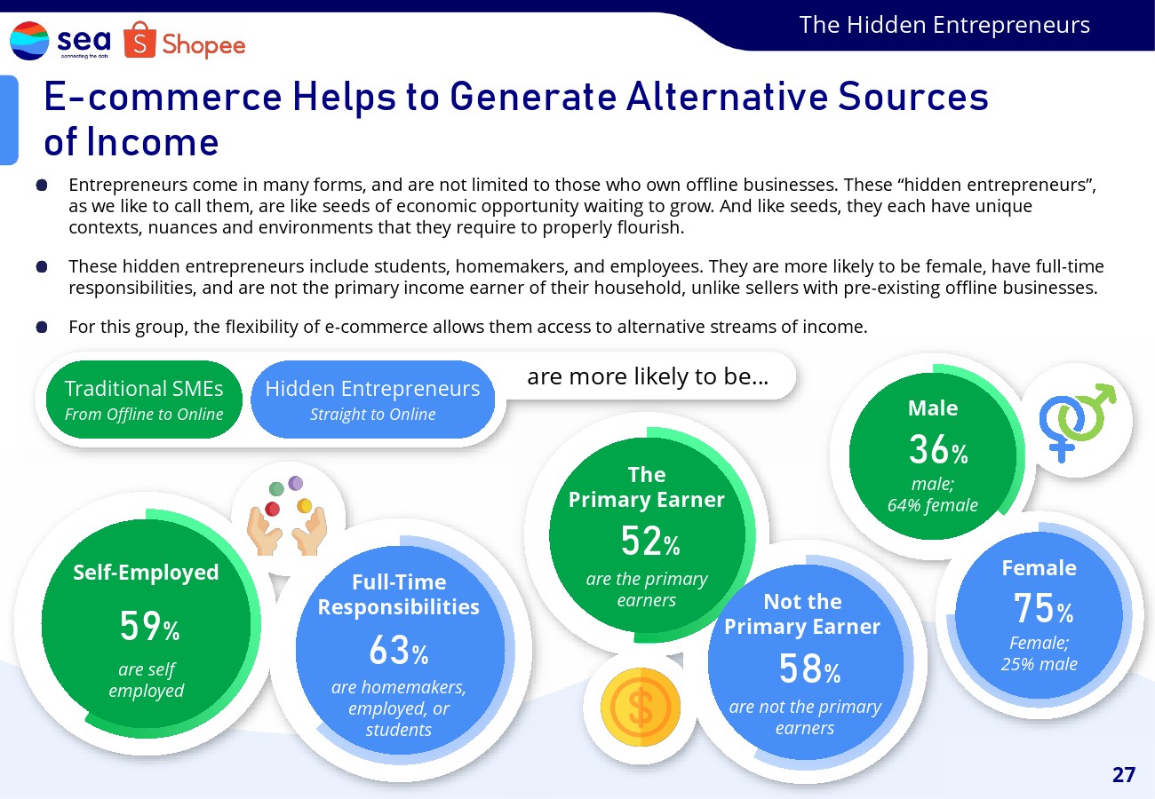 电子商务还帮助家庭主妇、学生和雇员等承担全职责任的群体创造其他收入来源,在这一过程中大大改善了他们的生计。