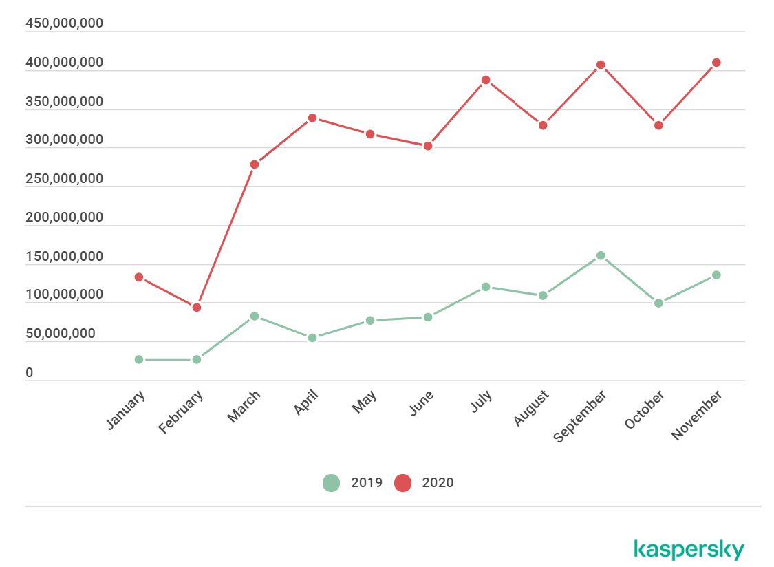 从3月初开始,Bruteforce.Generic.RDP攻击的数量猛增2020年前11个月的攻击总数达到33亿。