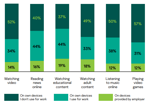 调查发现,2/3以上的受访者使用个人计算机在家办公。长期以来,使用自己的设备在网络安全领域一直存在争议,因为它使公司资源更容易受到攻击。即使对于那些由雇主提供设备的人(55%)也不会将工作和个人活动区分开。实际上,51%的员工承认在用于工作的设备上观看成人内容,而这些内容经常是网络犯罪分子的目标。