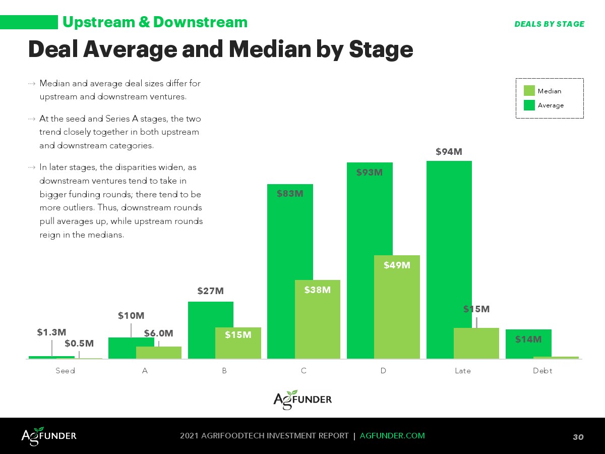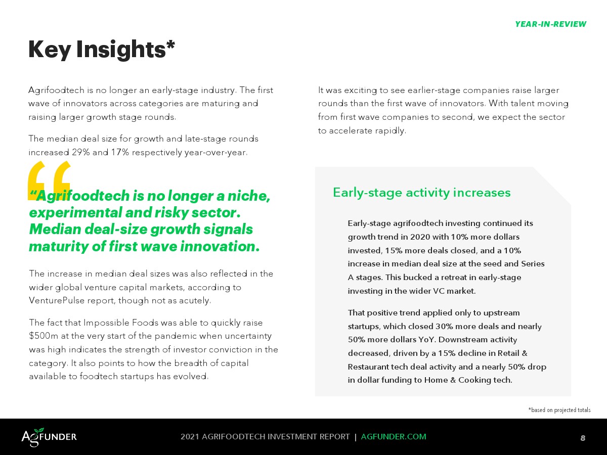 农业食品技术不再是一个初级产业。跨类别的第一波创新者正在走向成熟。增长型和后期交易的中位数同比分别增长29%和17%。