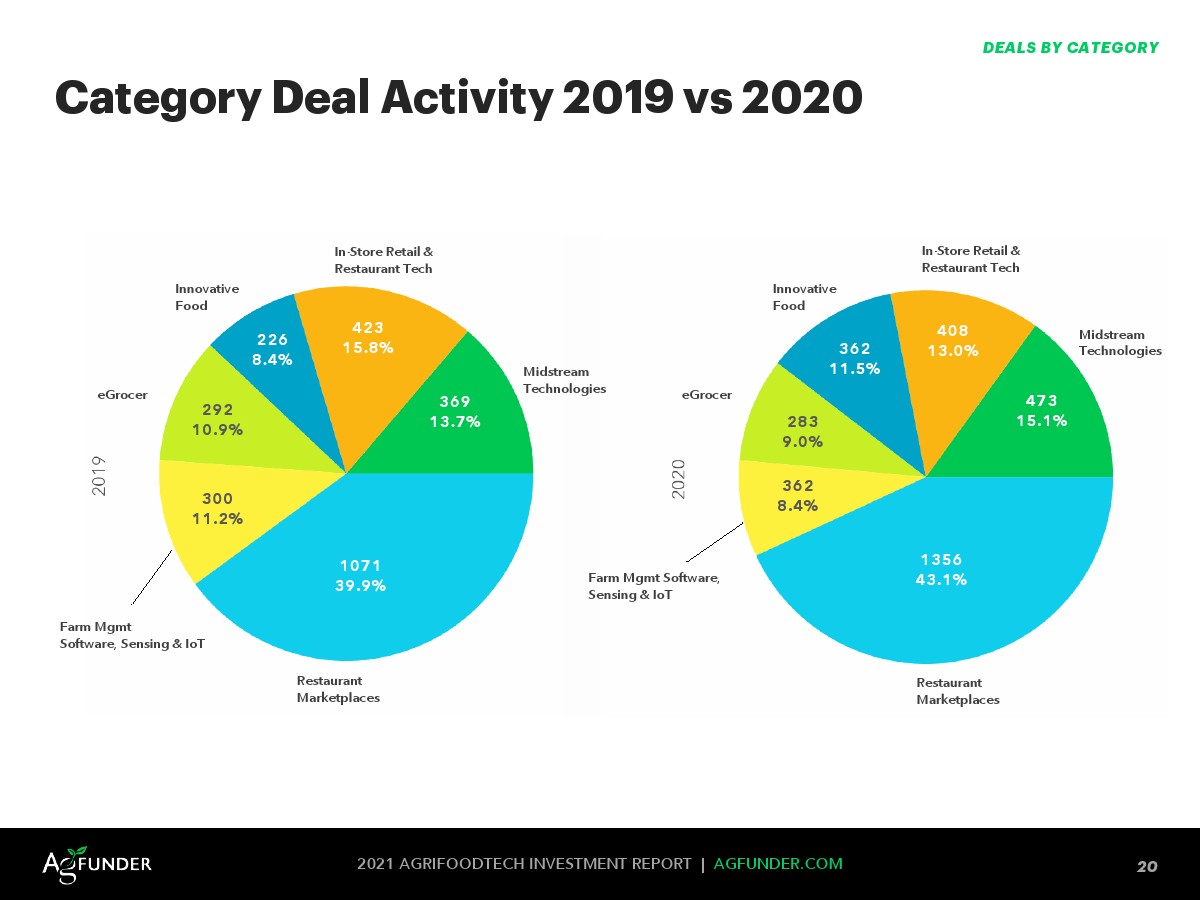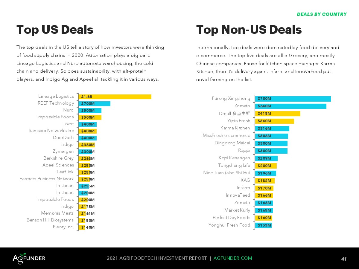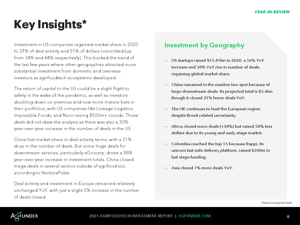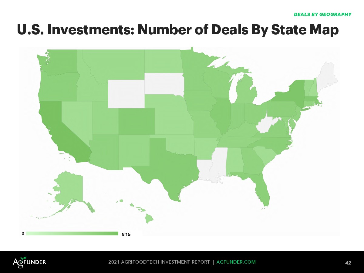 对美国公司的投资在2020年恢复了市场份额,占交易量的37%,占交易额的51%(2019年为34%和44%)。这与过去几年的趋势相反,随着农业食品技术生态系统的发展,其他地区吸引了更多国内外大量投资。