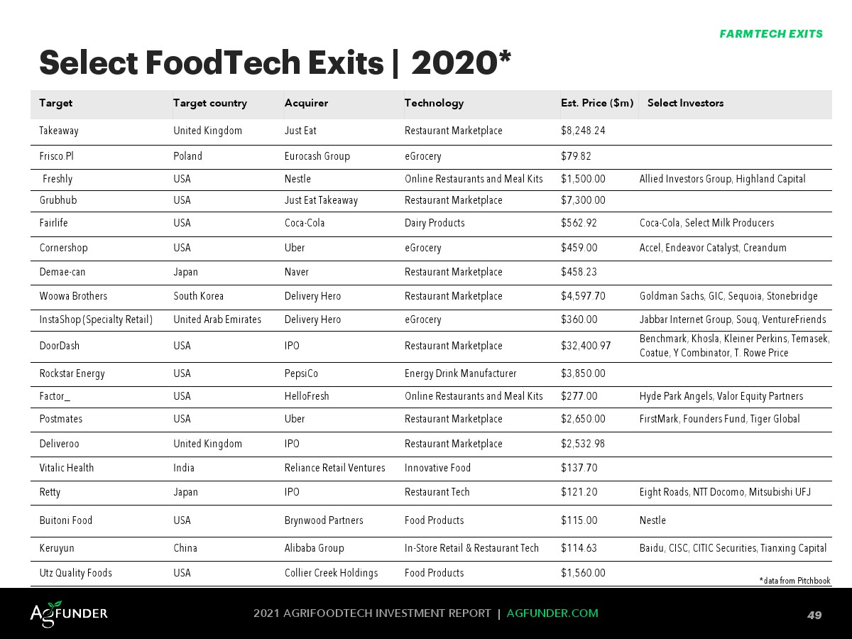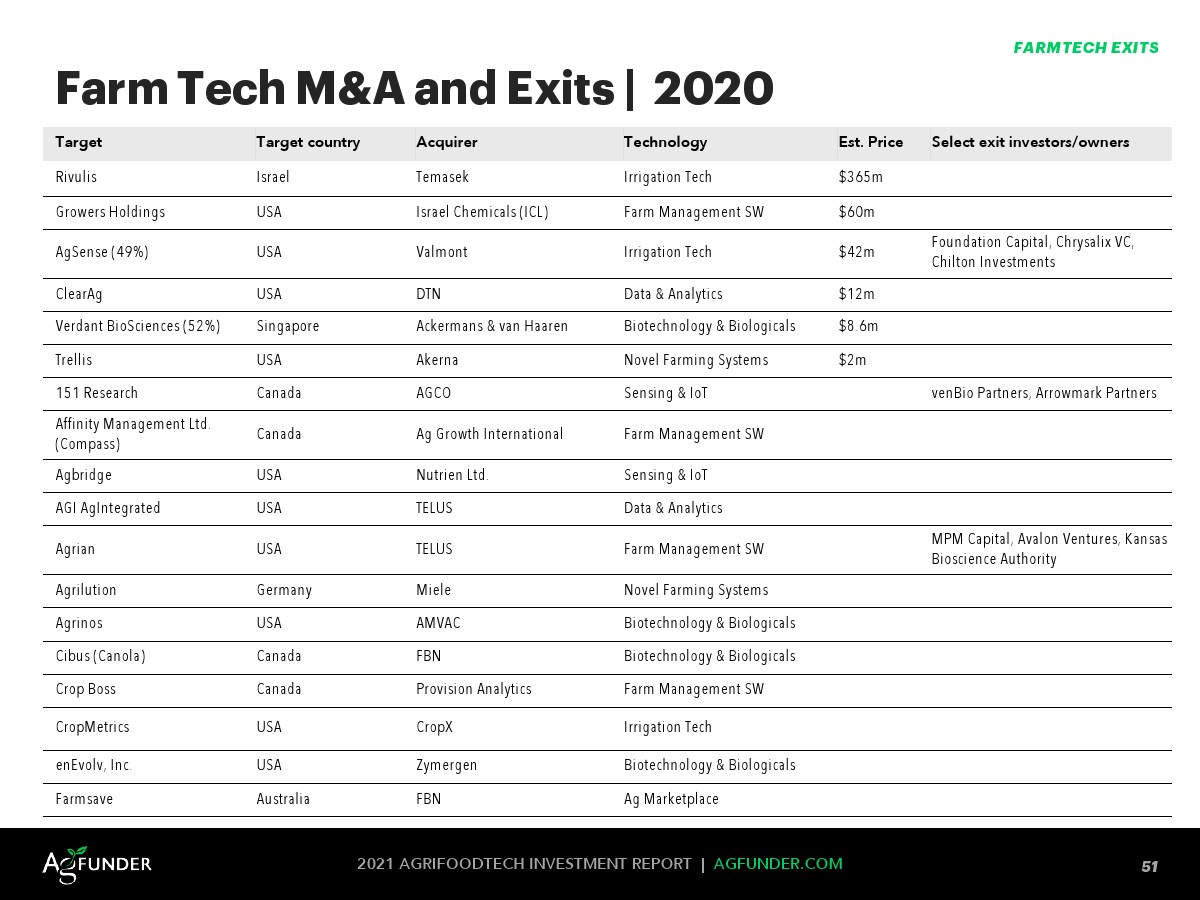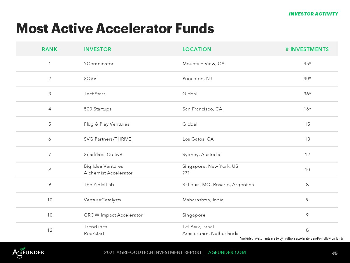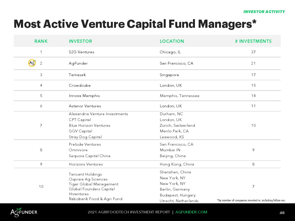 对美国公司的投资在2020年恢复了市场份额,占交易量的37%,占交易额的51%(2019年为34%和44%)。这与过去几年的趋势相反,随着农业食品技术生态系统的发展,其他地区吸引了更多国内外大量投资。