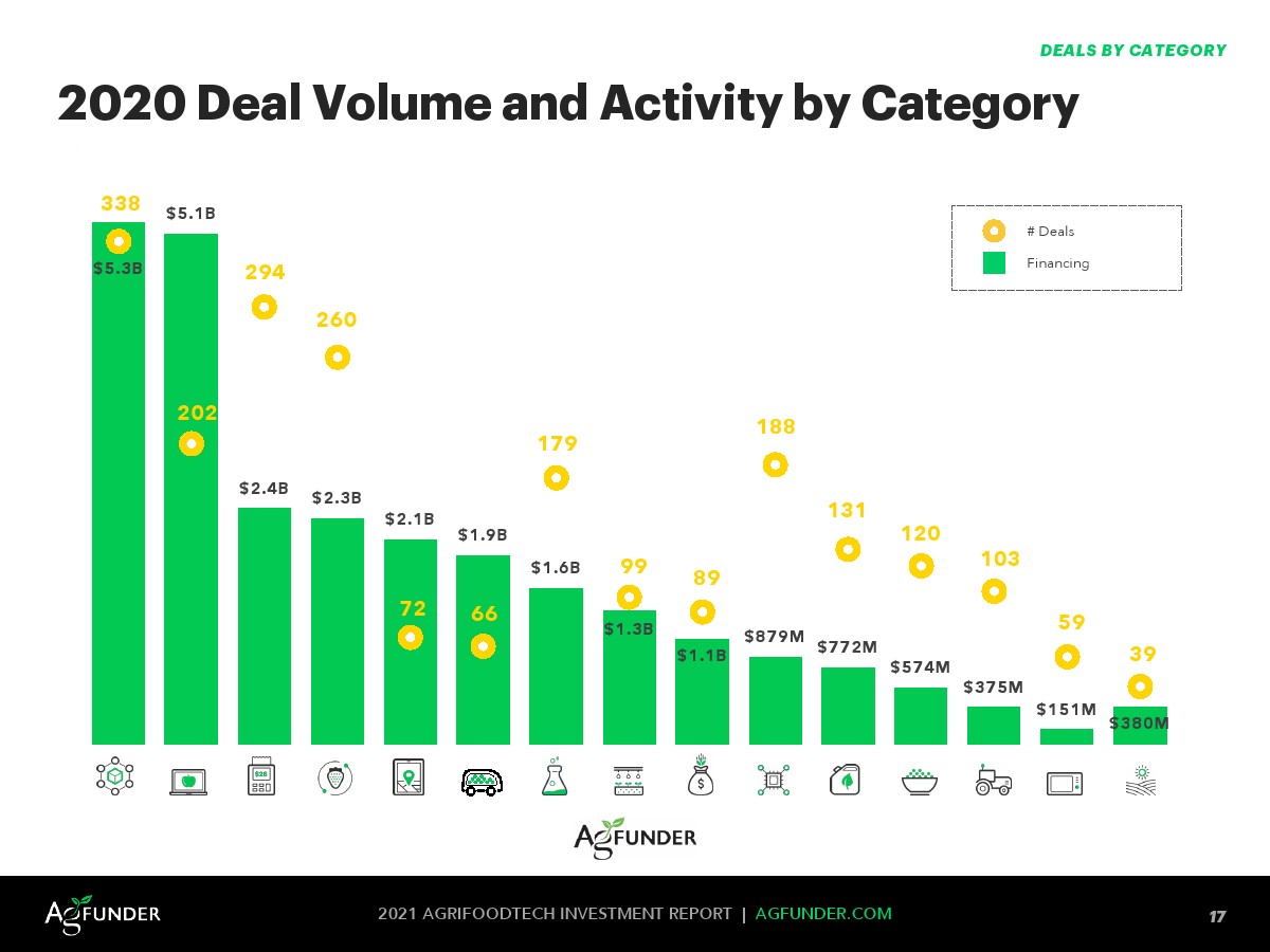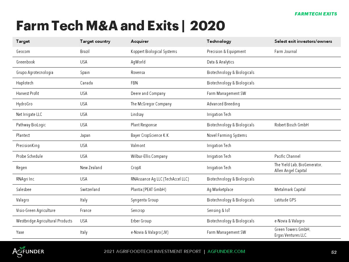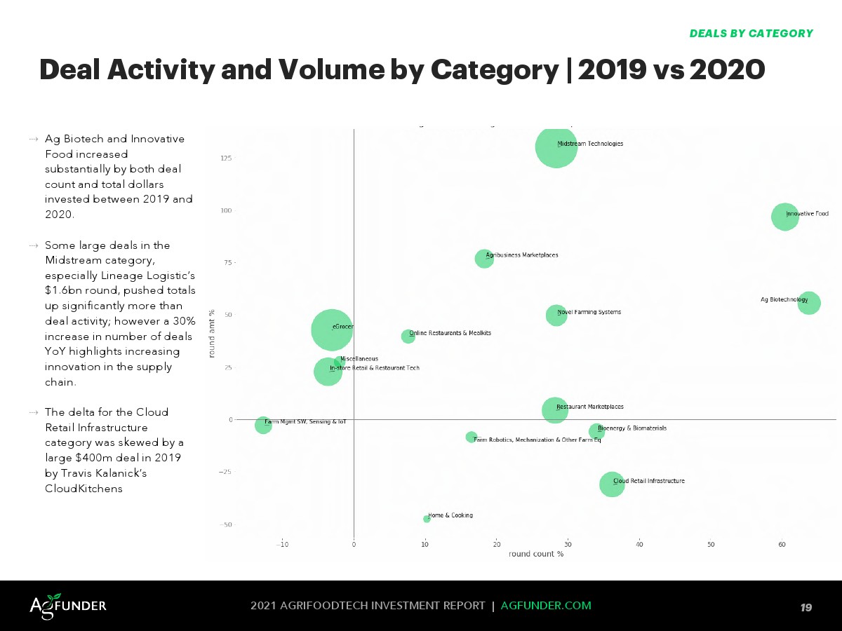 虽然在这两个类别中都失去了市场份额,但农业生物科技自身仍有显著增长,交易量增长70%,投资额增长60%。