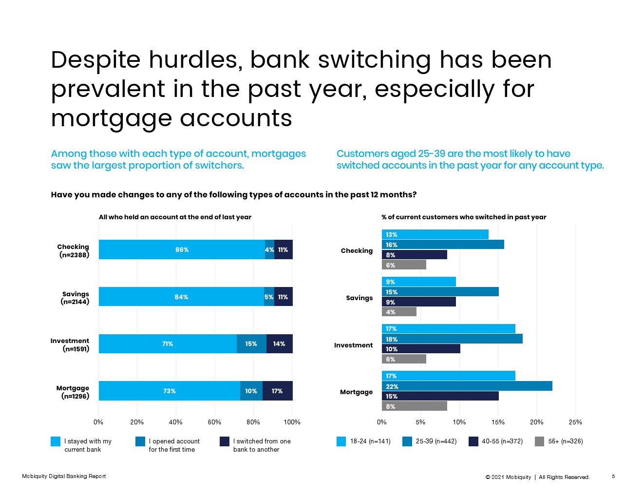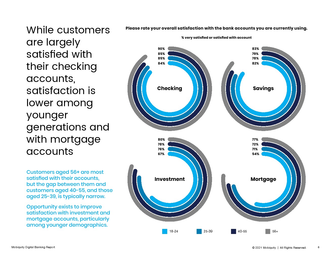 年轻顾客似乎比年长顾客更愿意改变。事实上,数据显示年轻客户比年长客户更不可能将他们对目前使用的银行的总体满意度评为非常满意/满意,而且他们也更可能在未来12个月内更换银行。