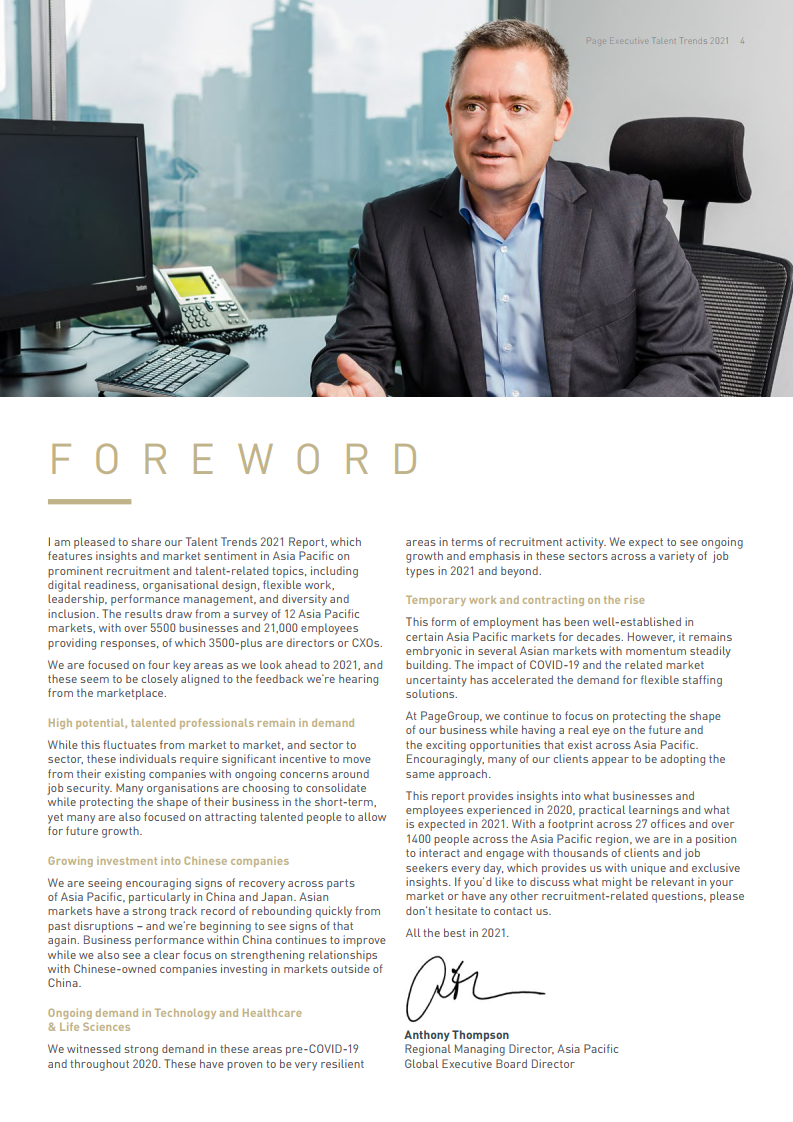 报告结果来自于我们面向亚太地区12个市场的问卷调查,超过5500家企业和21000名员工提供了反馈,其中超过3500名调查对象是总监或者高管。我们在展望 2021 年时预测了亚太人才市场的四大趋势,而这些趋势似乎与我们获取的市场反馈极为一致。