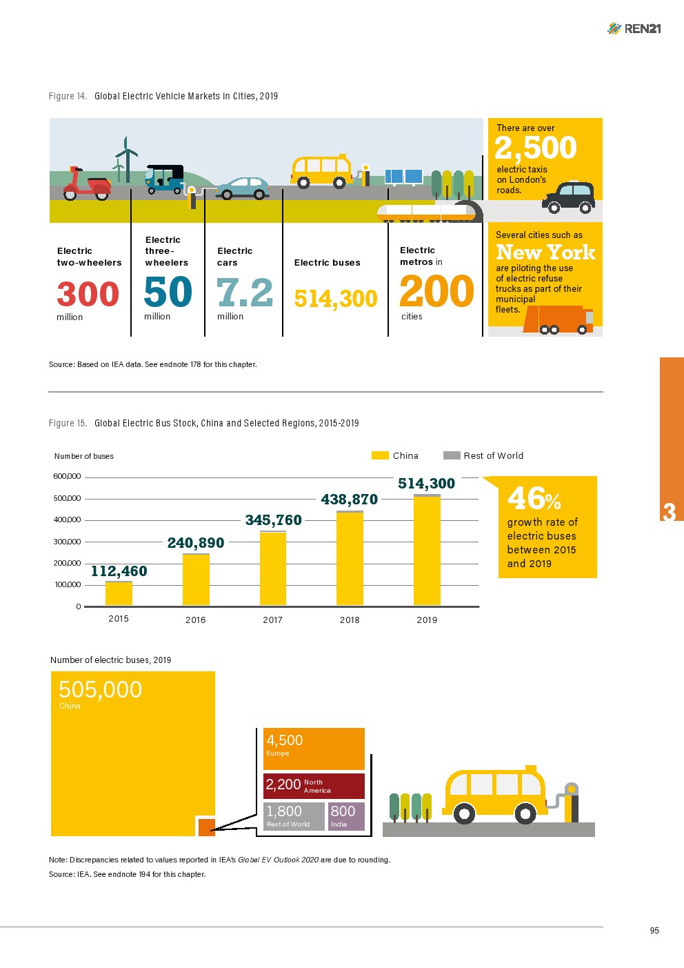 REN21的数据显示,早在2015年,中国的电动客车库存就已经达到11.1万辆,而欧洲只有130辆。到2019年的中国电动客车库存已攀升至50.5万辆,增长355%。