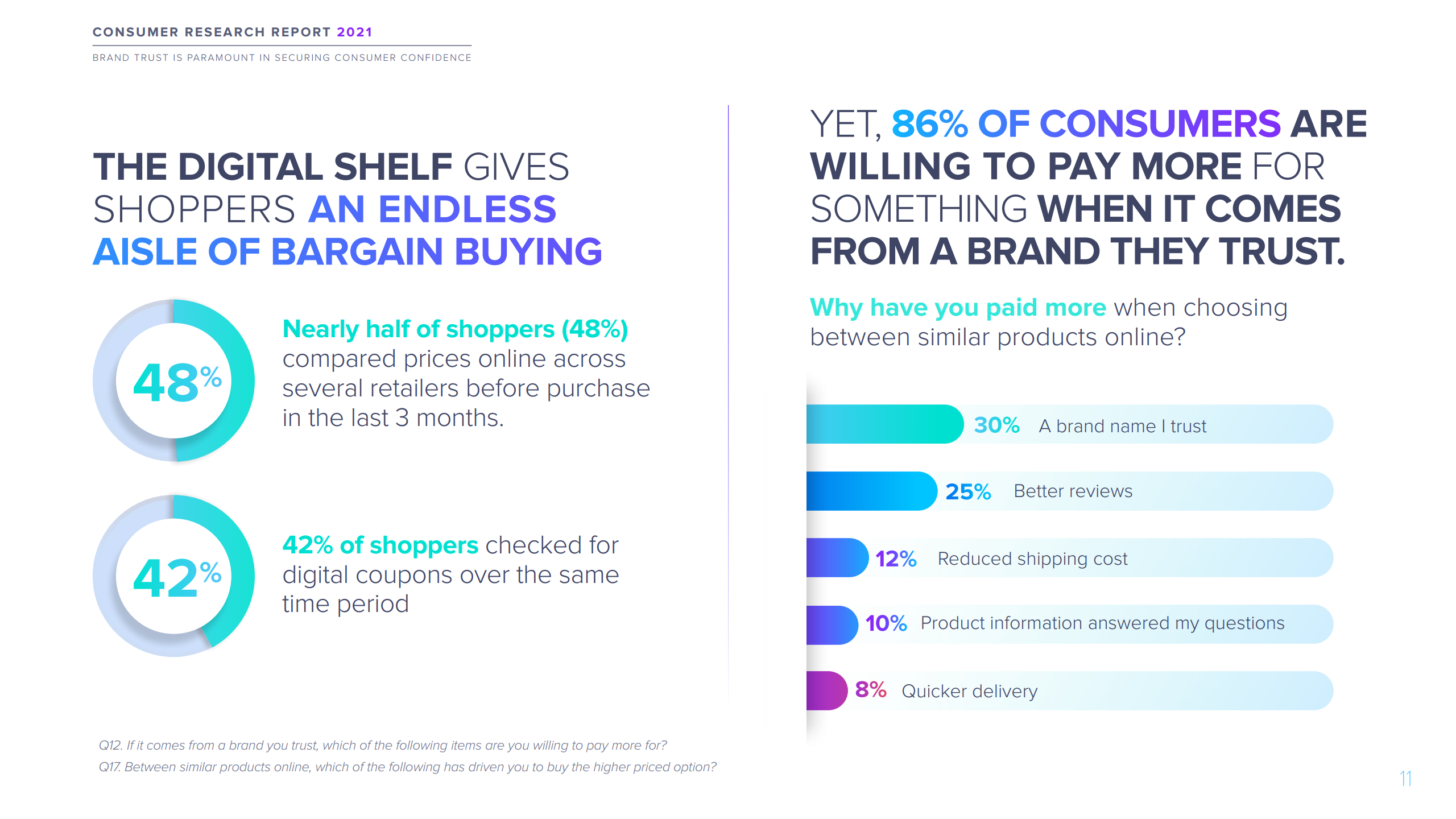 大约一半的消费者(48%)表示,他们在购买前会比较不同零售商的价格,但是,86%的受访者愿意为他们信任的品牌支付更多的钱,而且有3/10的消费者表示他们已经这样做了。