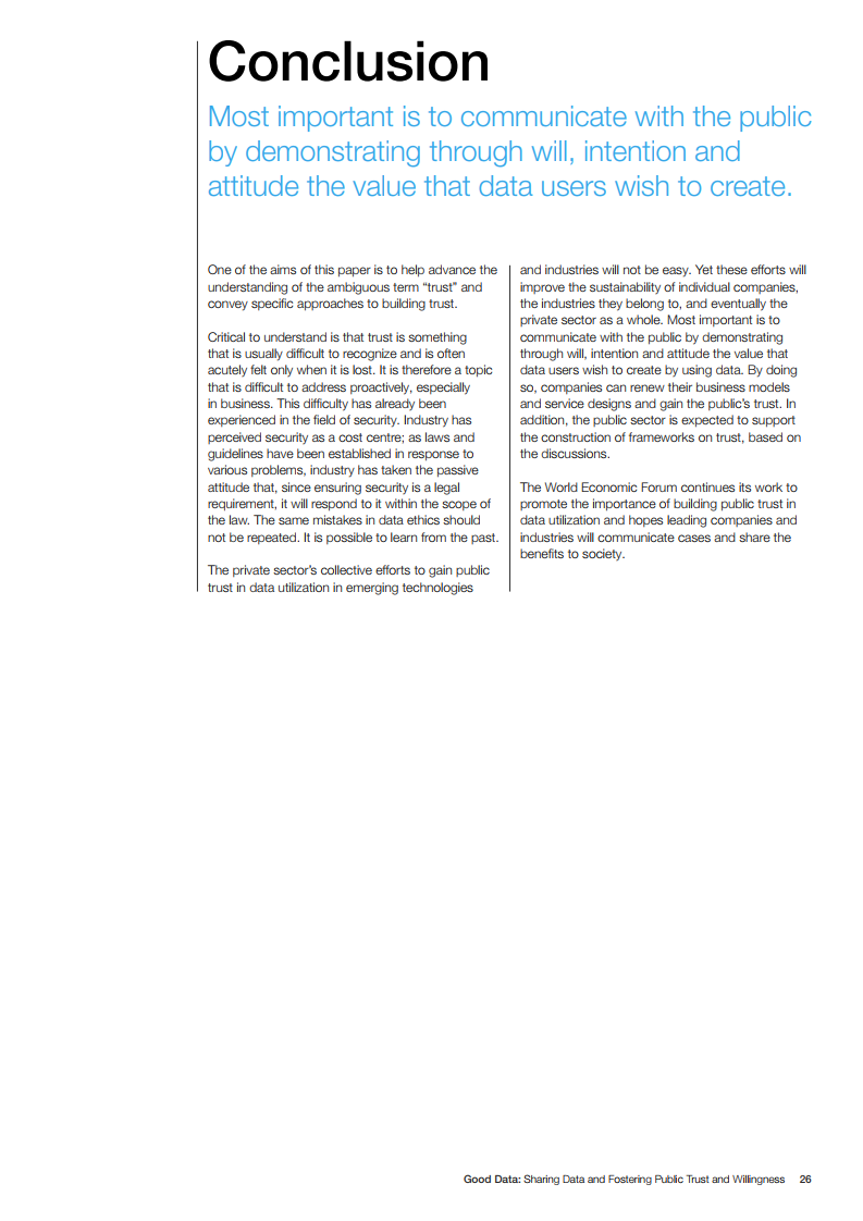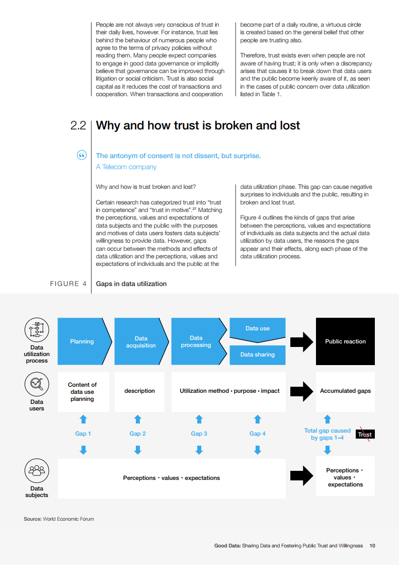 数据不仅是一种“主要”资产,对为特定目的收集和使用数据的组织具有价值,而且也是一种“次要”资产,通过更广泛的流通创造额外的价值。“良好的数据”源于数据的处理方式:考虑到隐私、公平、社会正义、道德和法律合规。通过正确处理数据、数据用户可以获得公众、个人和数据主体的信任,从而提高人们提供数据的意愿。本白皮书提出了两个框架,作为加速创新同时建立信任的工具:信任与意愿框架和良好数据框架。第一个框架旨在建立公众对数据二次利用的信任;第二个框架促进数据处理中的道德考量。