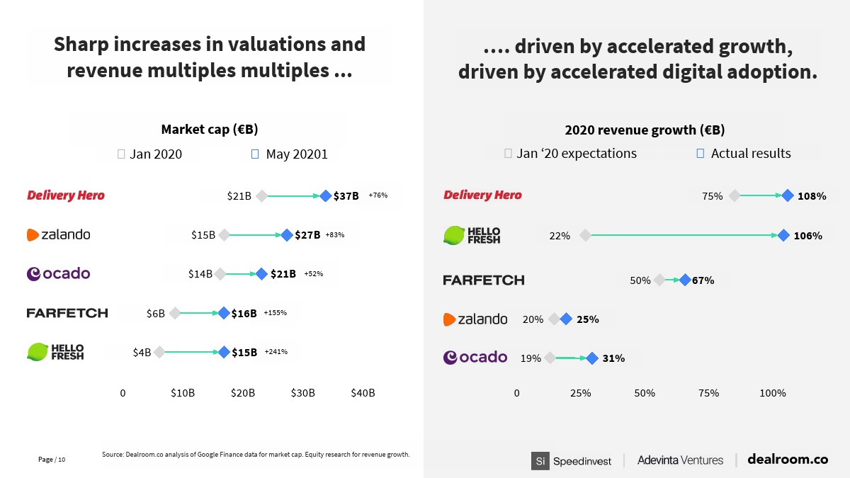与此同时,风险投资的纪录也再次被打破。科技现在被视为安全资产。低利率导致大量寻求风险的资本寻找更有利可图的目标。新冠大流行加速了数字化应用的使用。在线市场受益匪浅,尤其是食品、数字健康和电子商务等领域。