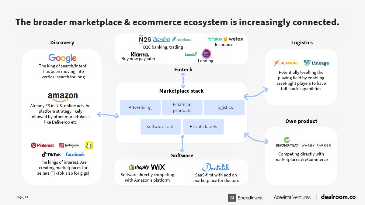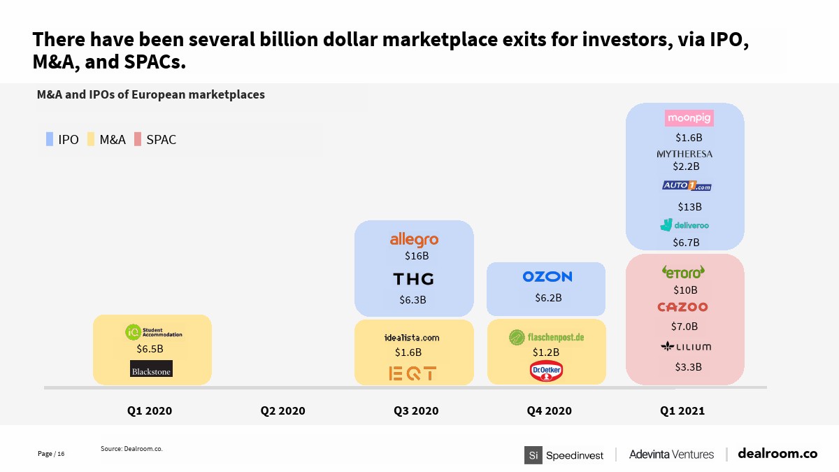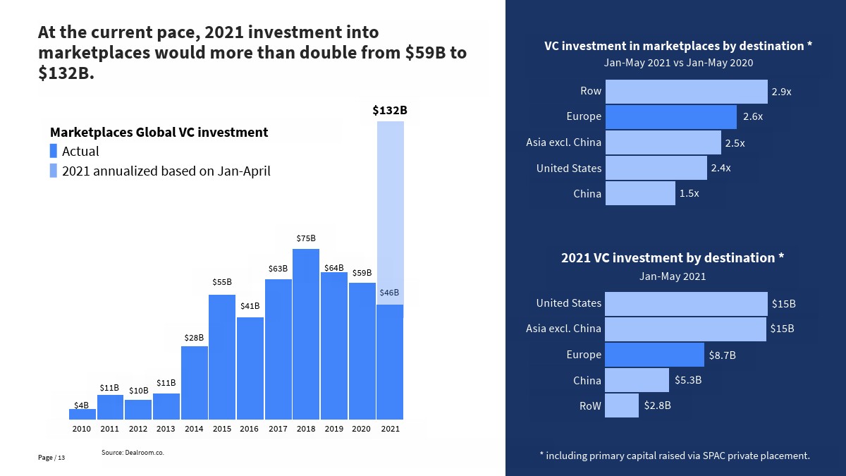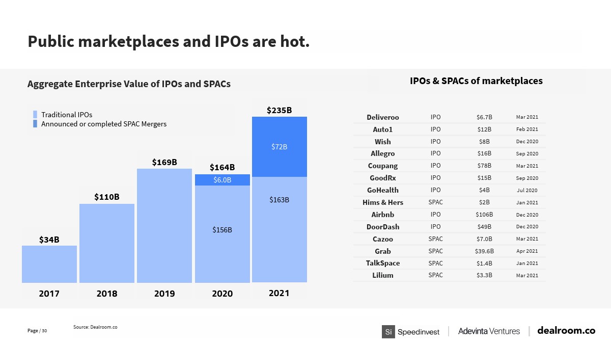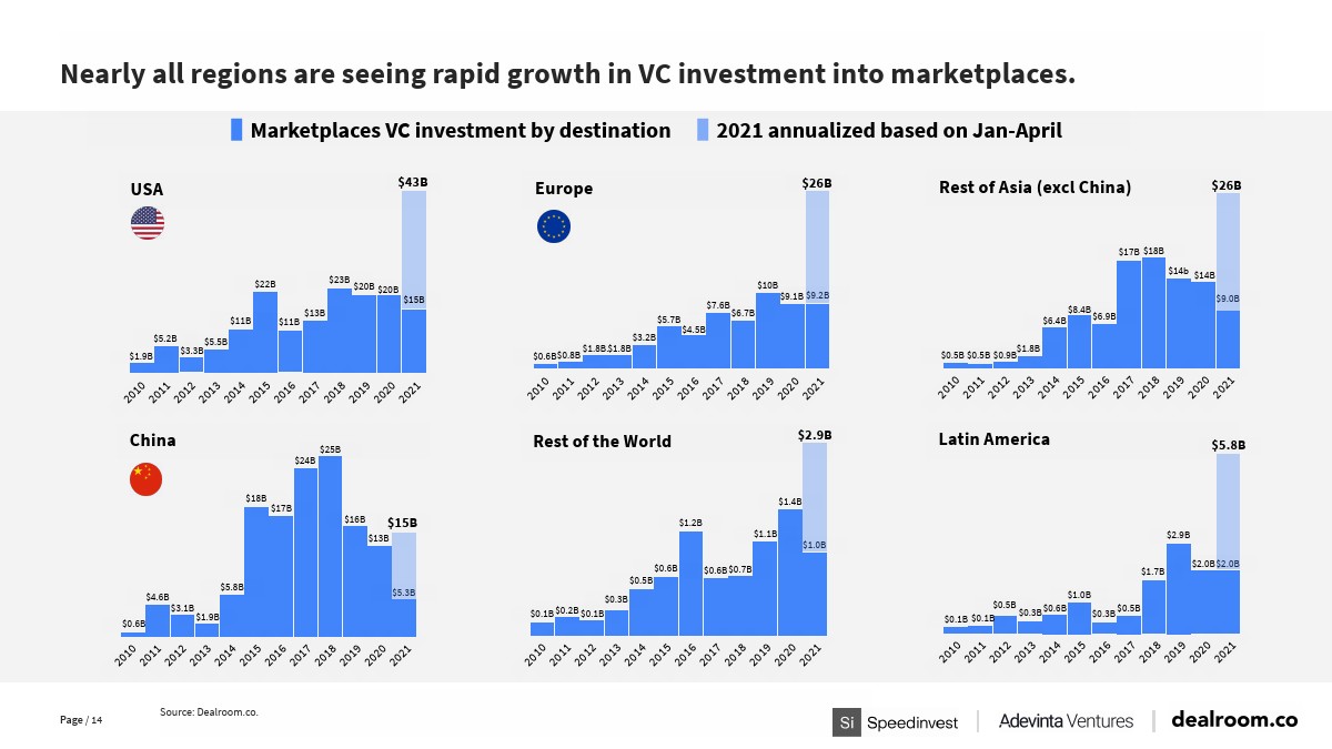 现在,有30个已知的在线市场价值达到200亿美元或以上,全球顶级市场(上市公司和私有独角兽)的总价值达5万亿美元。