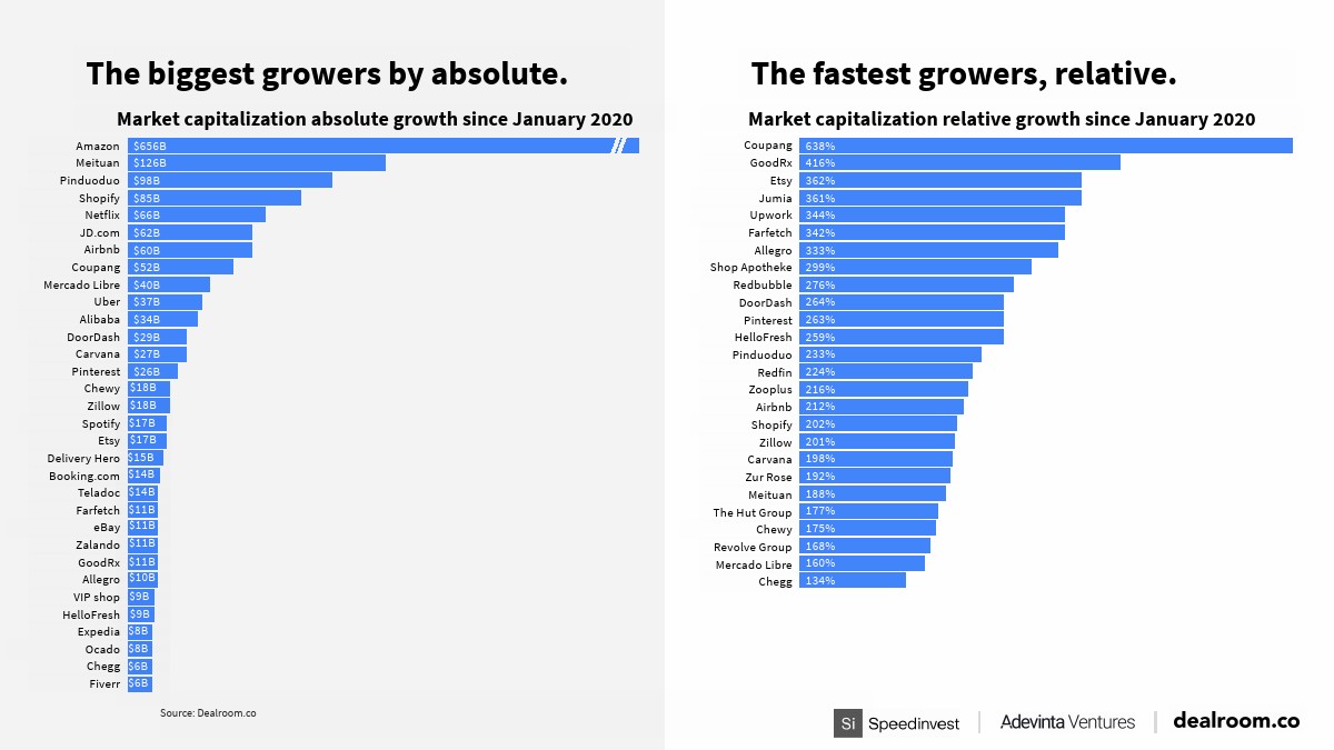 自2020年1月以来,全球在线市场(上市公司和私人独角兽)的估值增长了70%。
