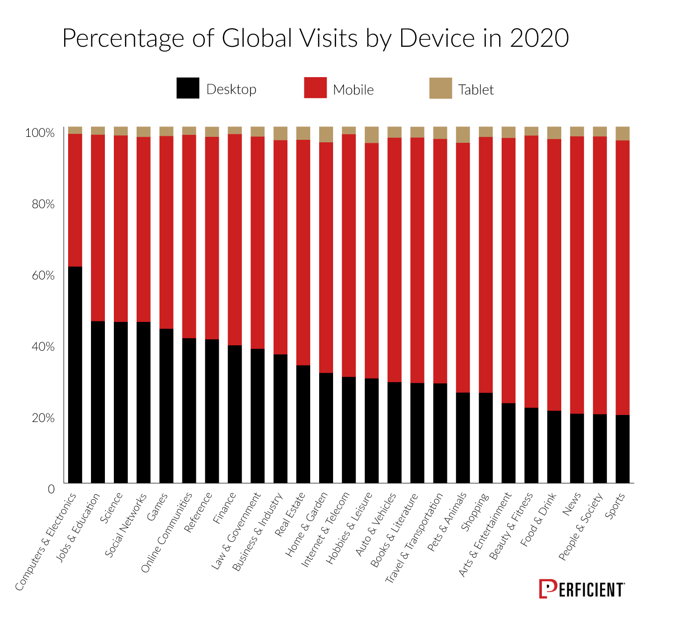 除电脑和电子产品外,移动设备在每个市场类别的访问比率都很高。