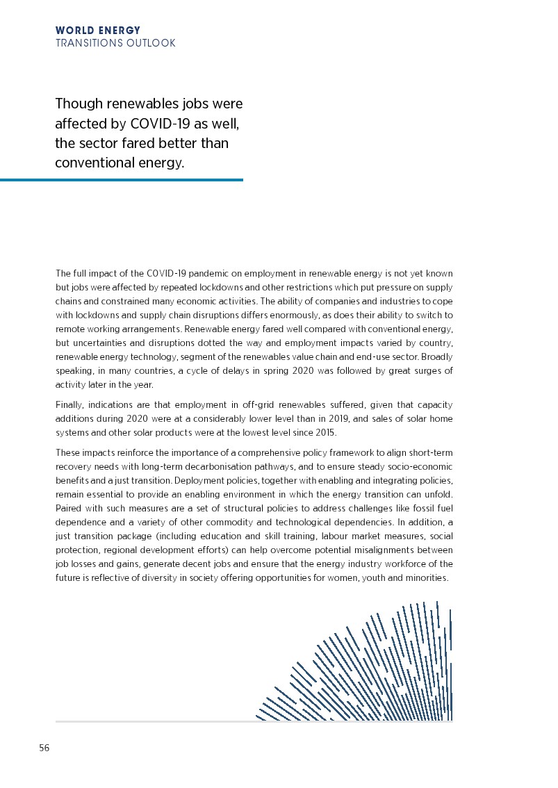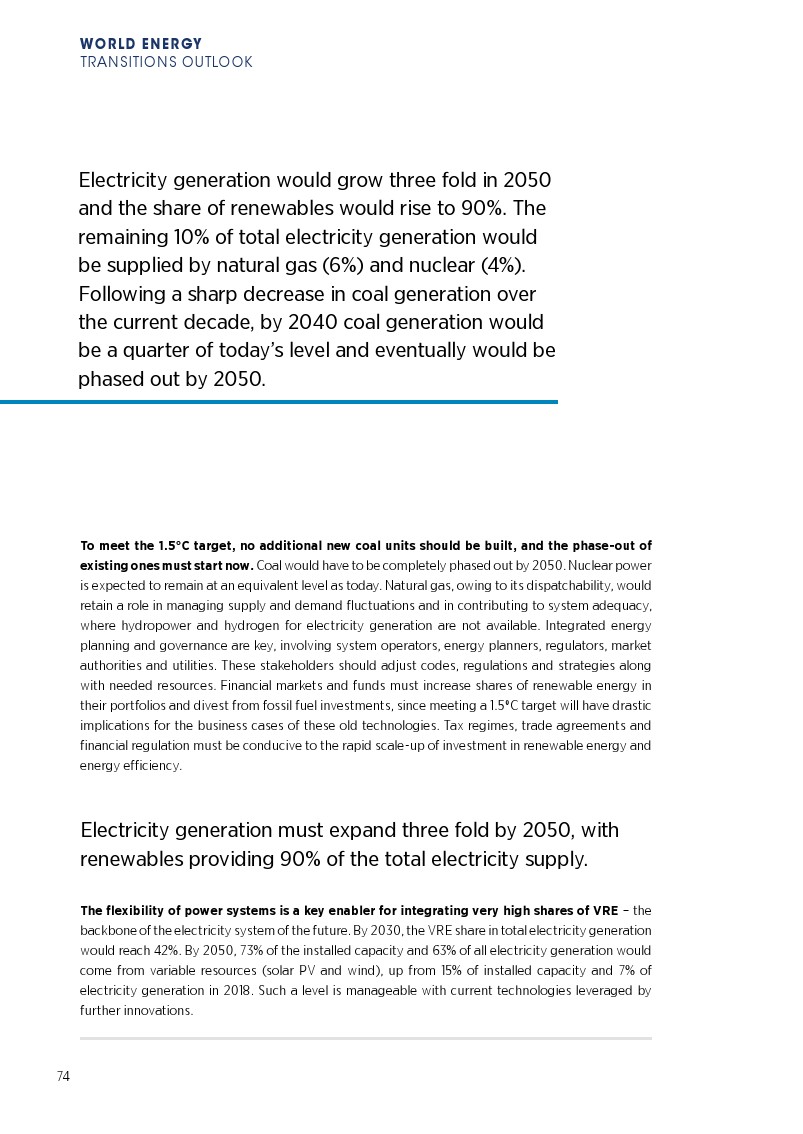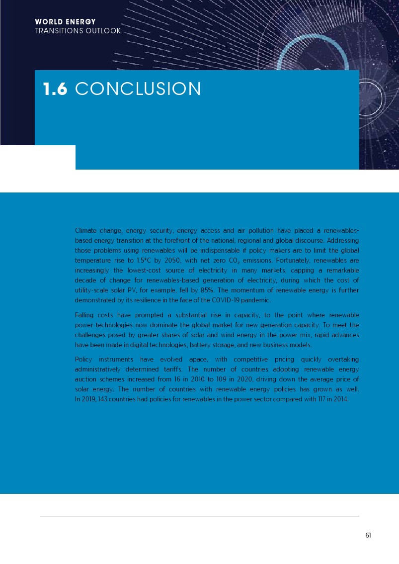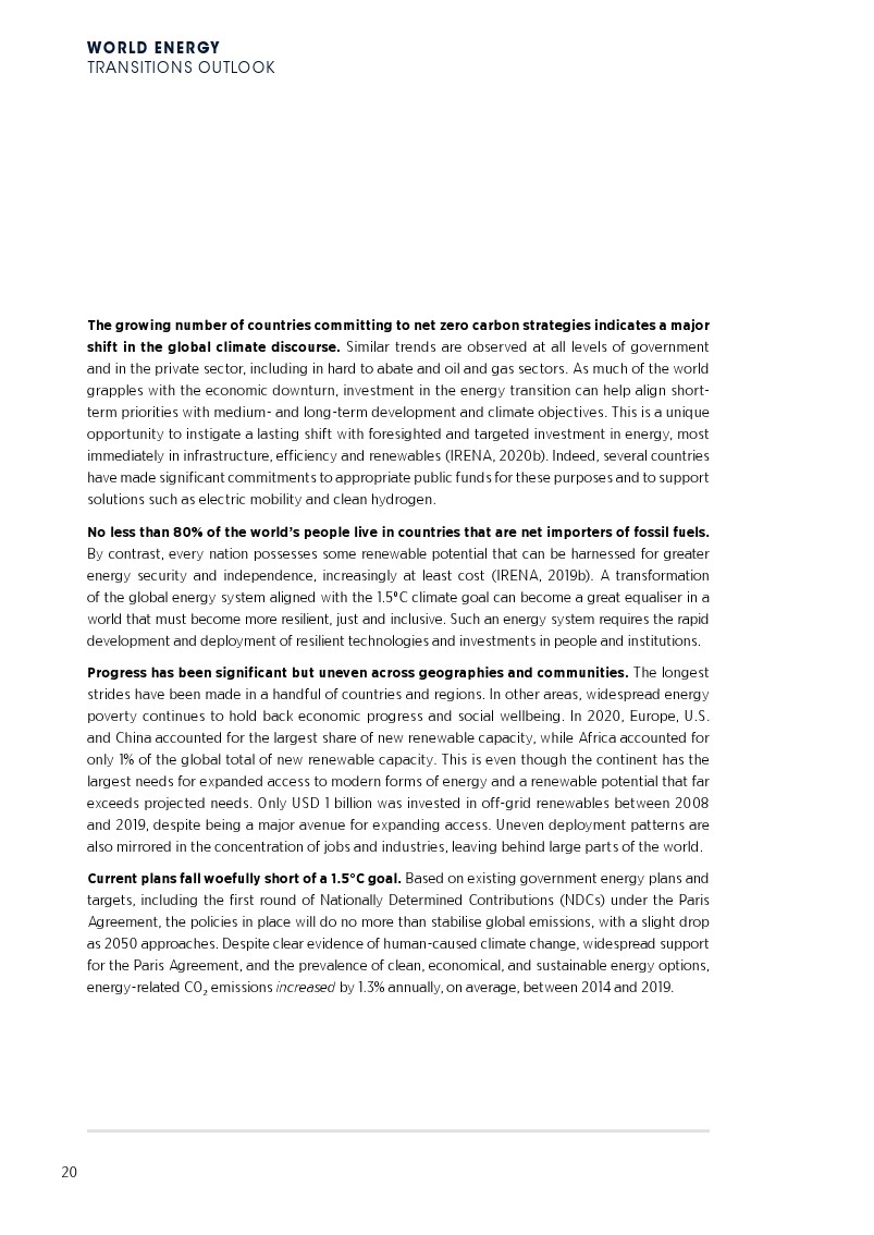 IRENA发布了新报告“世界能源转型展望”,以变化缓慢而著称的能源行业正在经历动态转型。气候变化、能源贫困和能源安全对支撑发展和工业战略的迫切需要,使得可再生能源和相关技术的广泛采用成为必不可少的解决方案。尤其是在过去十年,政策驱动因素、技术发展和国际合作已将这些技术从利基转向主流。即使面对新冠大流行造成的动荡,基于可再生能源的系统也表现出非凡的弹性,太阳能和风能占比高的基于可再生能源的电力系统的可靠性表现优秀。